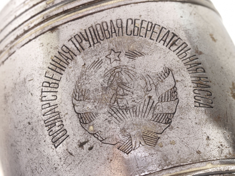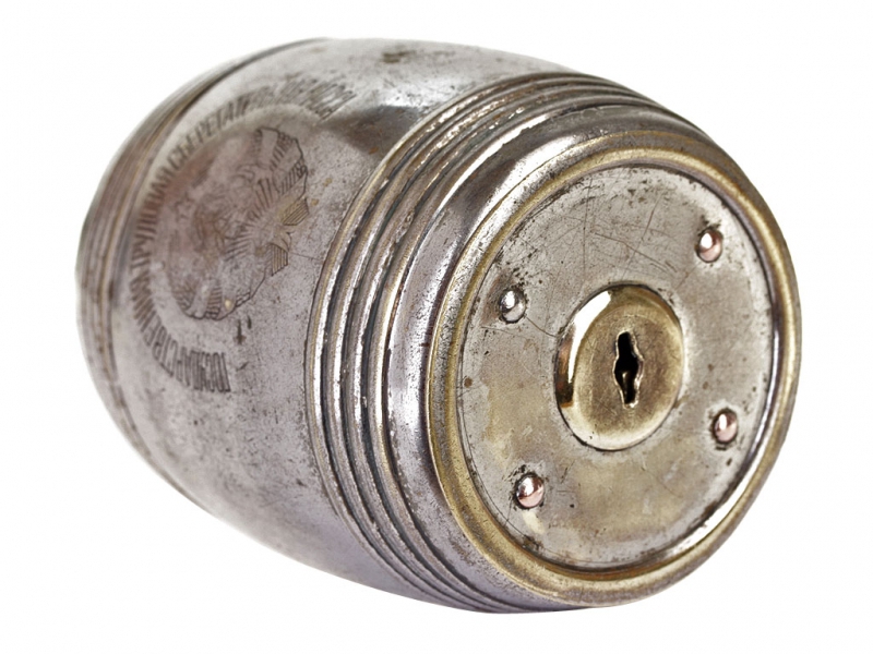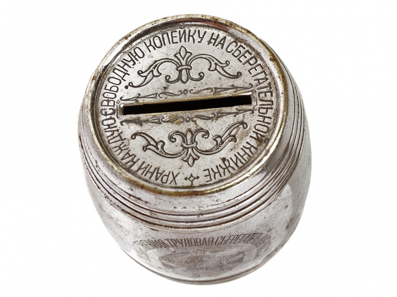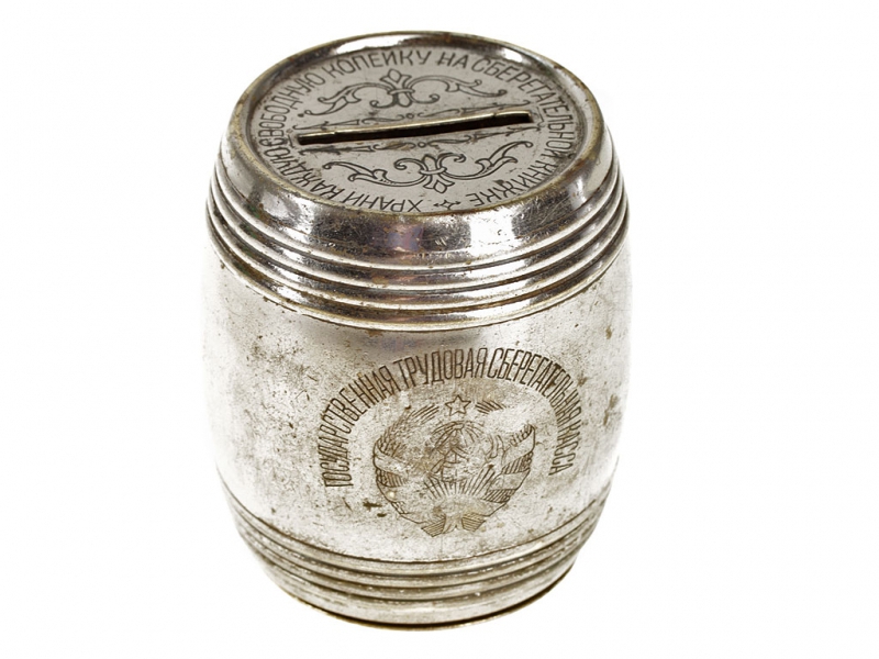 Металлическая копилка для мелочи выпуска конца 1920-х годов. Изготовлена в виде бочонка, на крышке - девиз "Храни каждую свободную копейку на сберегательной книжке". Хорошее состояние, без вмятин и дефектов. Примечательно, что ключ не прилагался к копилке, а хранился в сберкассе - владелец приходил туда с копилкой, она вскрывалась в его присутствии, а накопленная мелочь зачислялась на сберкнижку - отсюда и девиз на крышке.