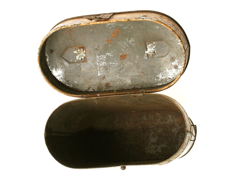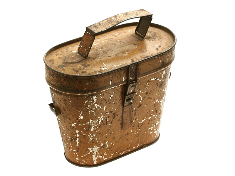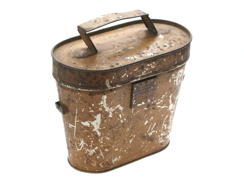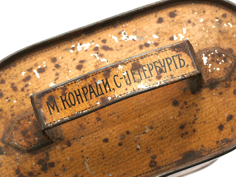 Коробка для леденцов, изготовленная из жести в виде футляра для армейского полевого бинокля фирмой "М.Конради" в Санкт-Петербурге. Классический патриотический сувенир времен Великой войны.