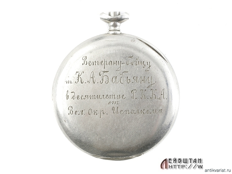 Мельхиоровый корпус от карманных часов с наградной надписью: "Ветерану-бойцу т. К.А.Бабьяну в десятилетие РККА от Вол. Окр.Исполкома".