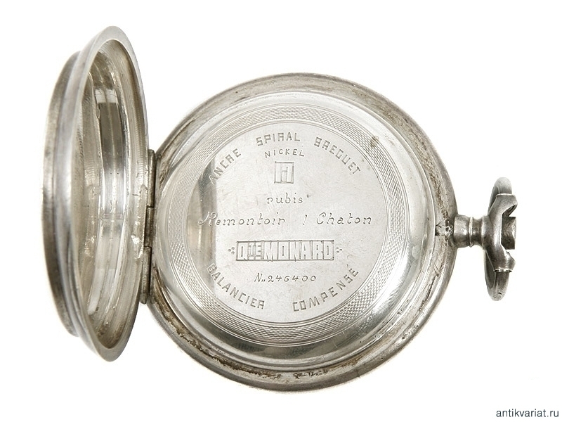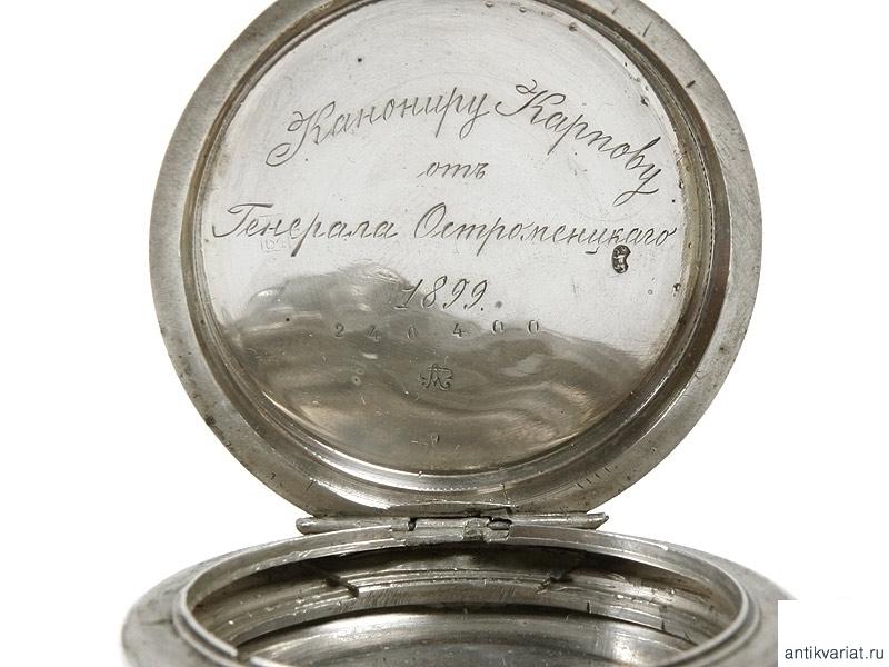 Серебряный трехкрышечный корпус призовых часов с гравировкой на внутренней крышке: "Канониру Карпову отъ генерала Остромецкаго". Начало ХХ века. Очень хорошее состояние.
