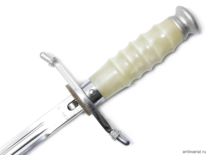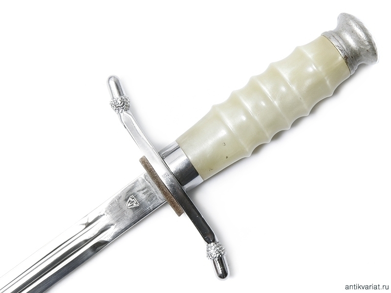 Рукоять из пластмассы белого цвета с никелированными навершием и гардой.
