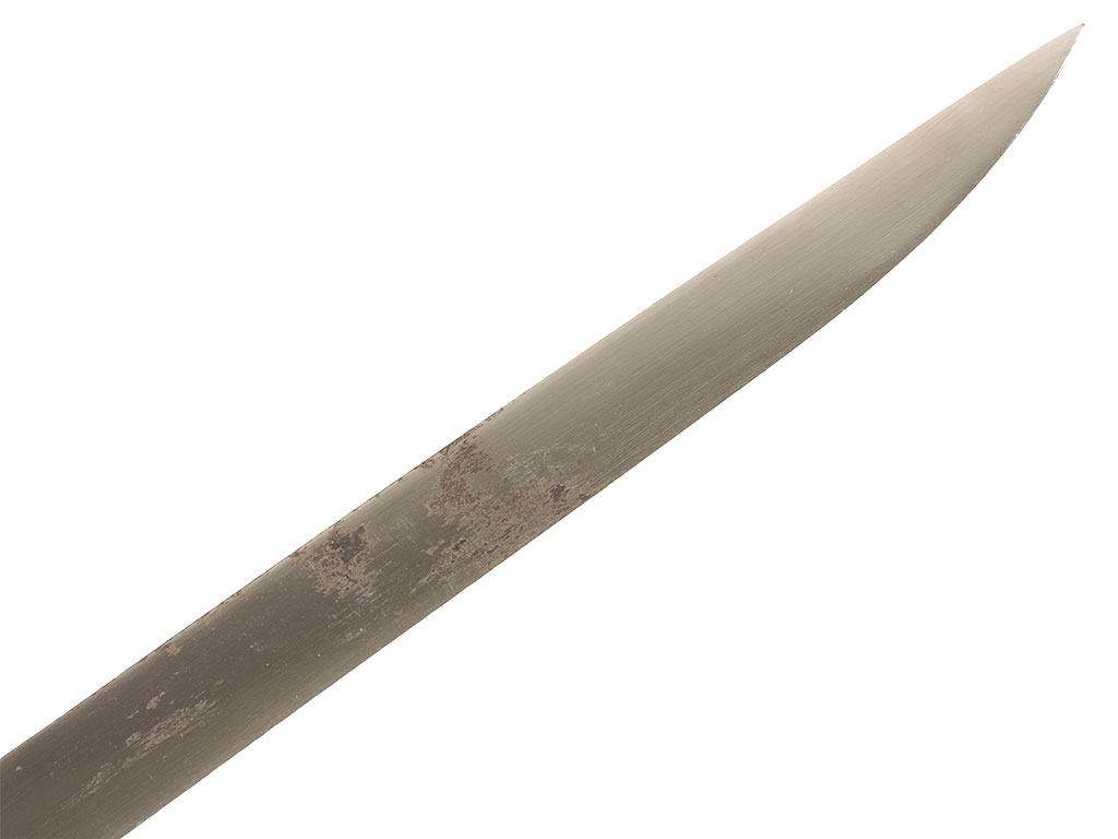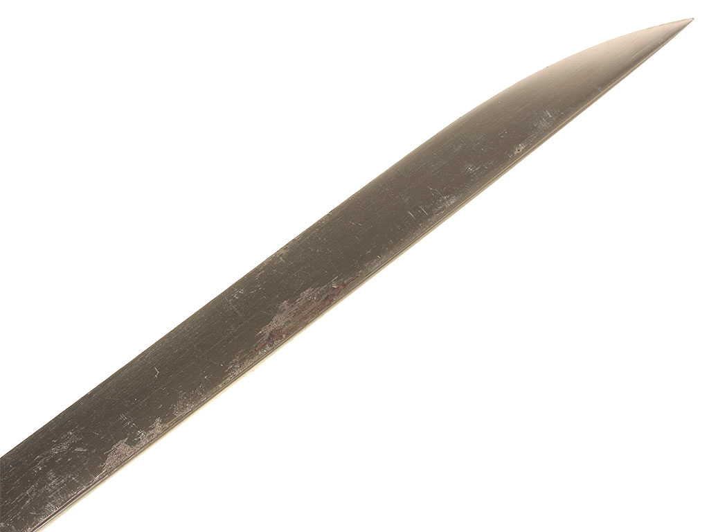 Армейский офицерский кортик образца 1883 года, изготовленный в годы Второй мировой войны. Рукоять целиком изготовлена из пластика цвета слоновой кости. Навершие латунное, почти полностью сохранилось золотистое лаковое покрытие. Гарда и муфта латунные. Клинок никелированный, без клейм. Ножны деревянные, обтянутые темно-коричневой кожей, с латунным устьем и наконечником.