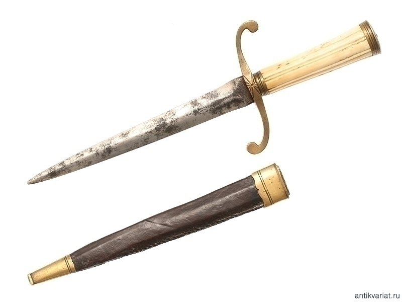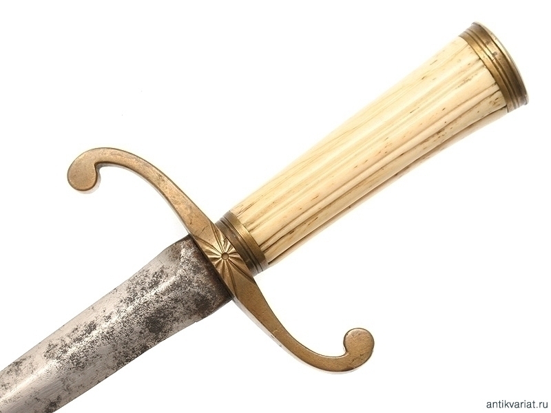 Кортик морской офицерский первой половины XIX века. Клинок без клейм, рукоять из слоновой кости с латунным прибором. Ножны кожаные, с латунным устьем и наконечником.