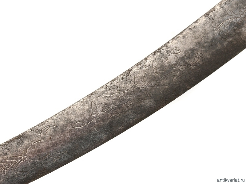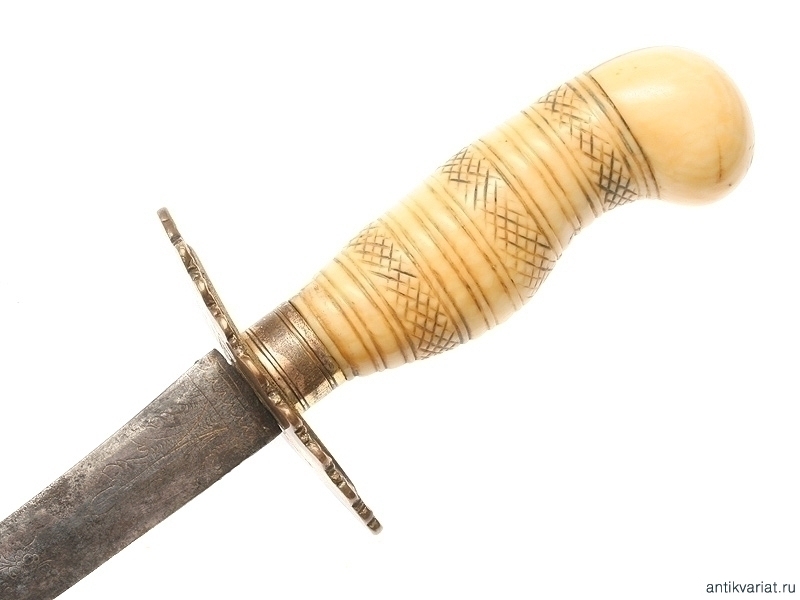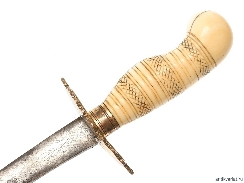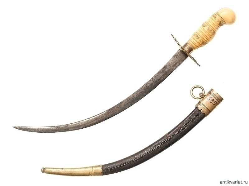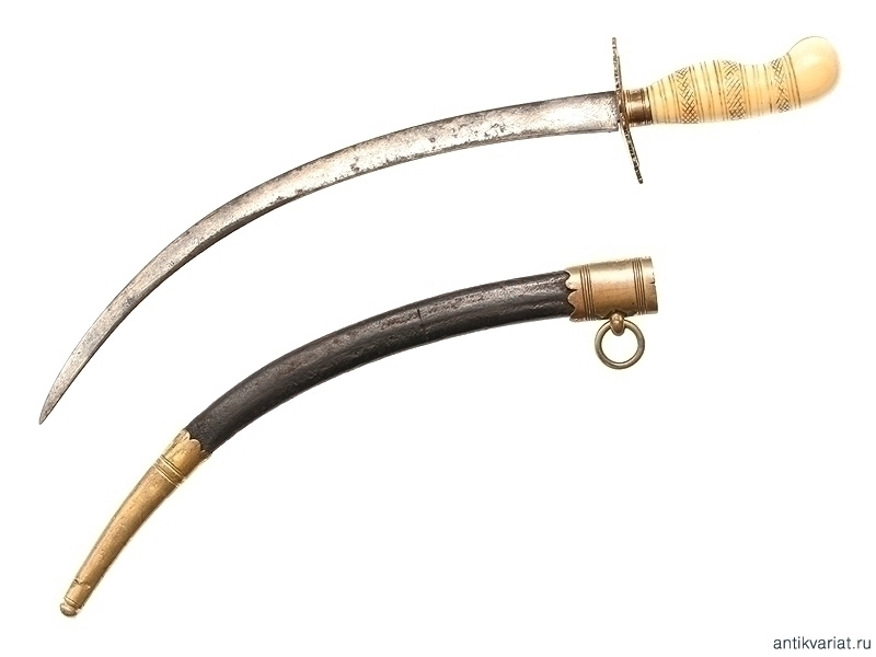 Кортик морской мичманский начала XIX века. Клинок без клейм, украшенный с трудом проглядывающимся гравированным растительным орнаментом, рукоять из слоновой кости, с латунным прибором, сохранившим остатки позолоты. Ножны кожаные, с латунным прибором.