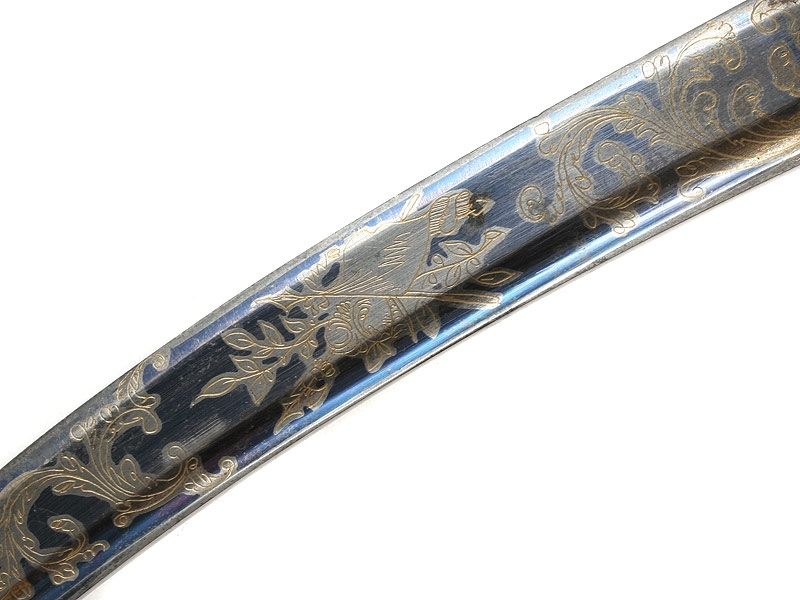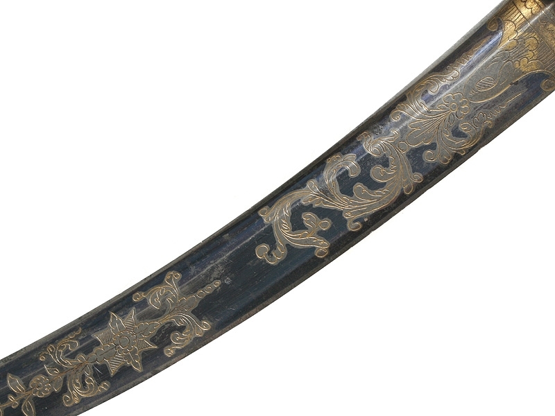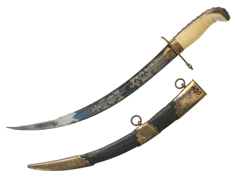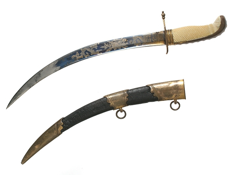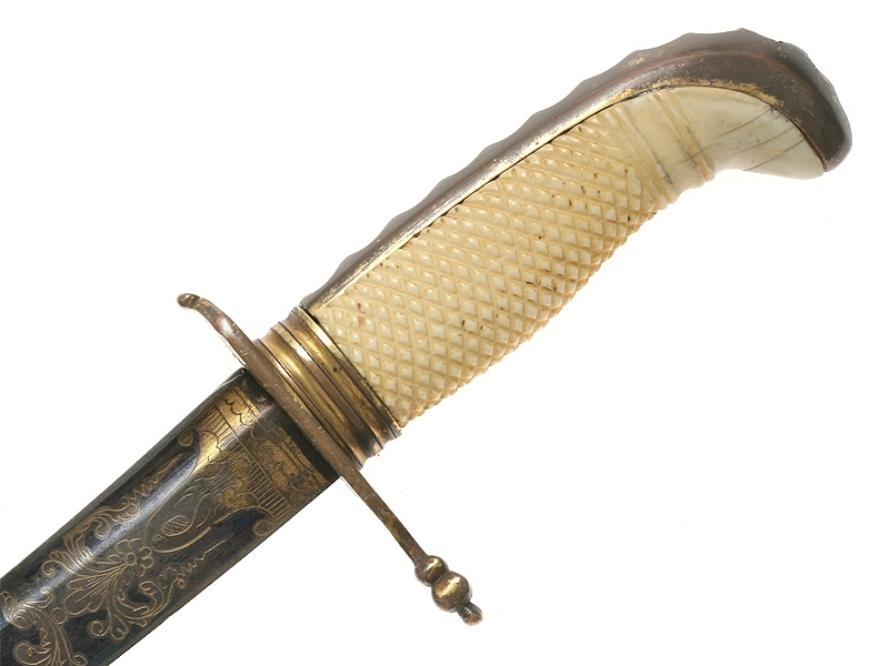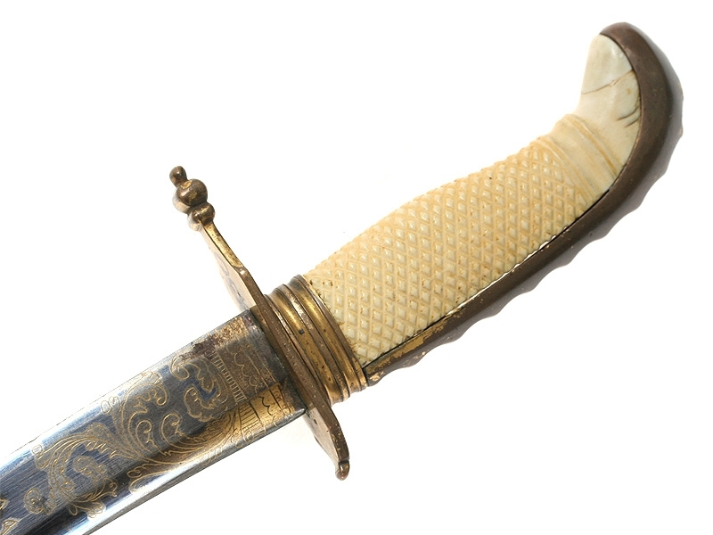 Кортик морской мичманский начала XIX века. Клинок без клейм, украшенный гравированным растительным орнаментом, канфарением и золочением. Рукоять из слоновой кости, с латунным прибором, сохранившим остатки позолоты. Ножны кожаные, с золоченым латунным прибором.