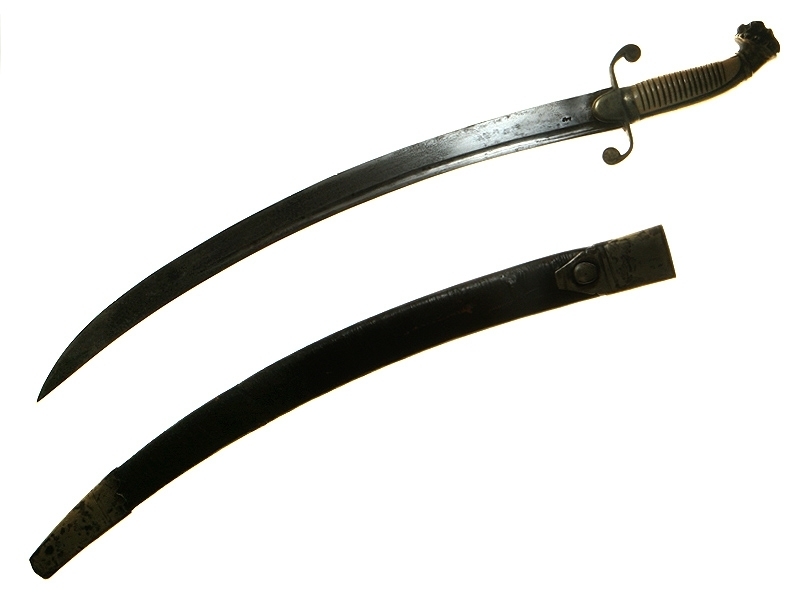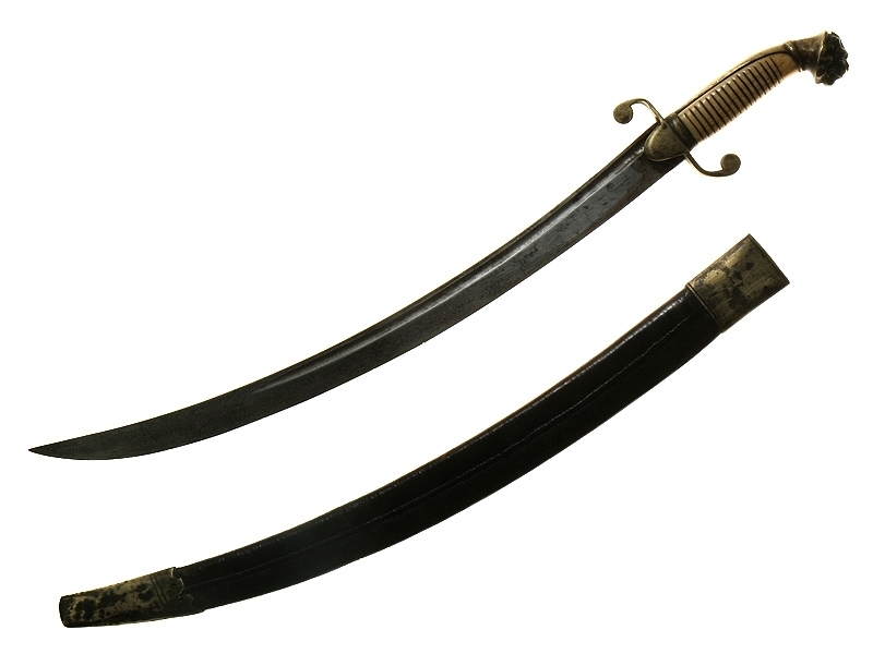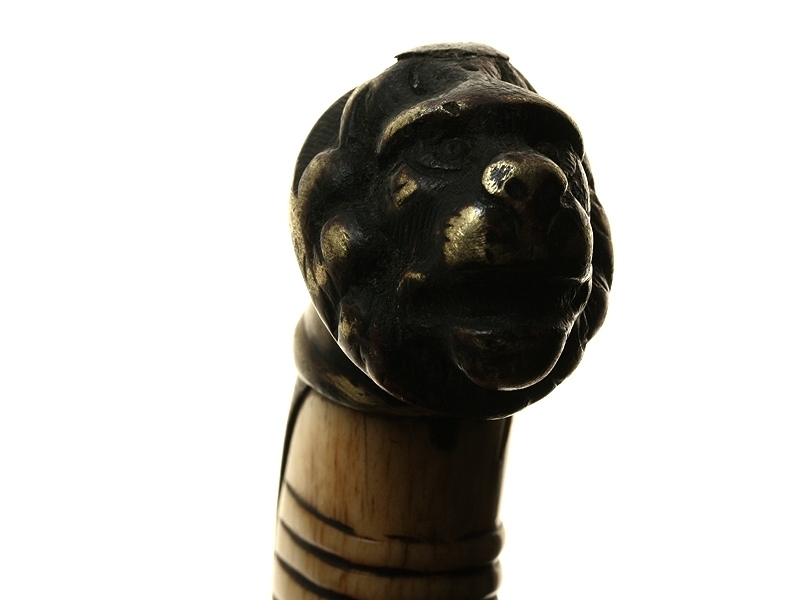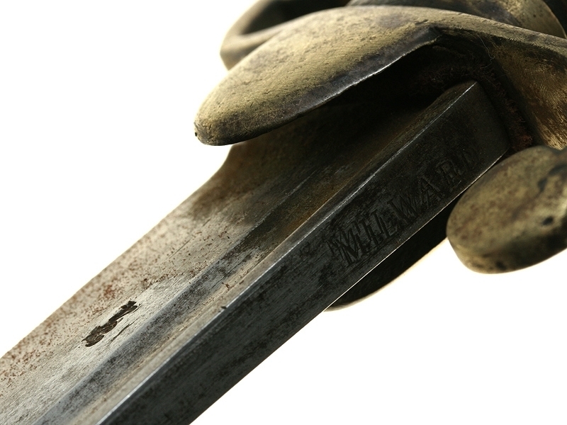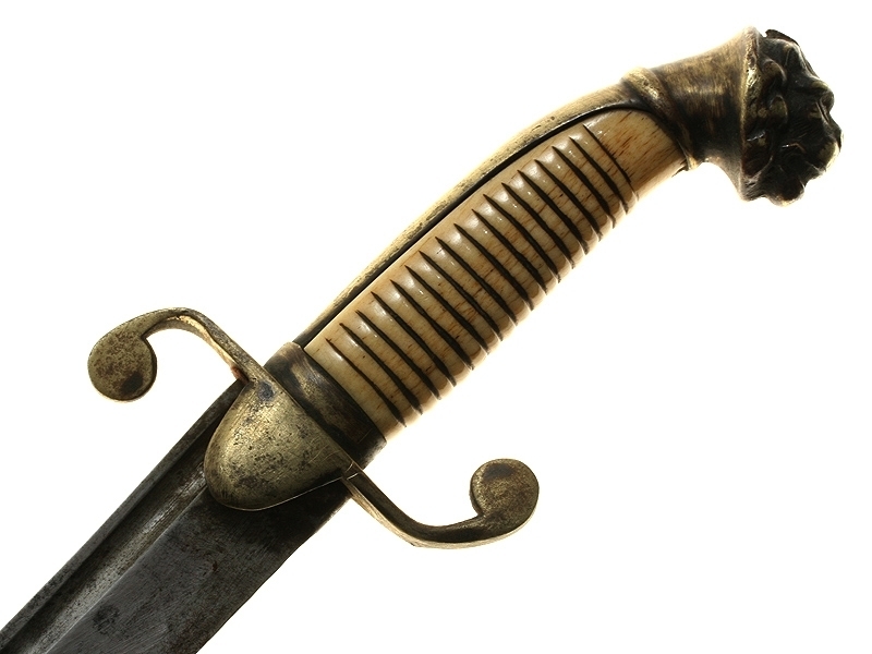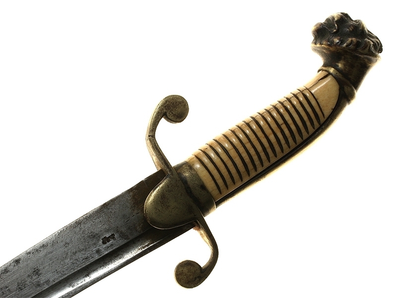 Кортик английский морской мичманский середины XIX века. Клинок с одним узким долом, на обухе клинка - надпись "Milward". Рукоять из слоновой кости, с латунным прибором. Головка рукояти представляет собой голову льва. Ножны кожаные, черного цвета, с латунным прибором.