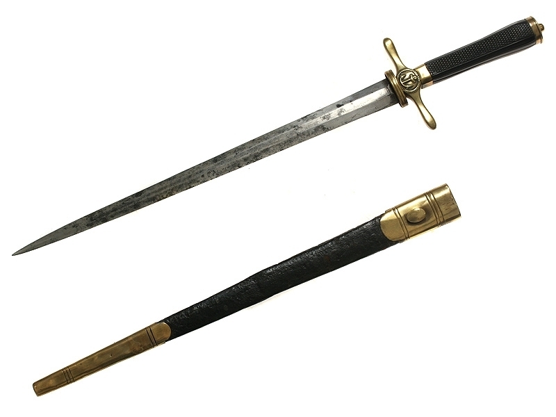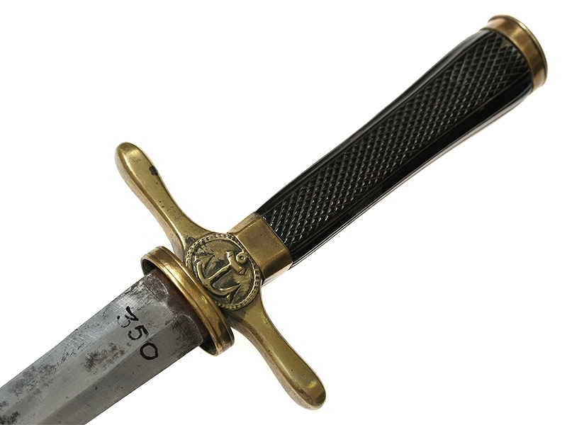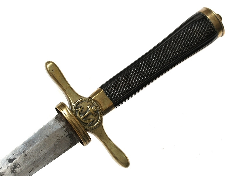 Кортик морской офицерский периода Первой Империи (1804 - 1814 годы). Клинок без клейм, шестигранного сечения. Рукоять из черного рога, прибор рукояти бронзовый. Перекрестие с обеих сторон украшено изображением якоря в овальном медальоне. Ножны из черной кожи, с латунным устьем и наконечником. Хорошее состояние.