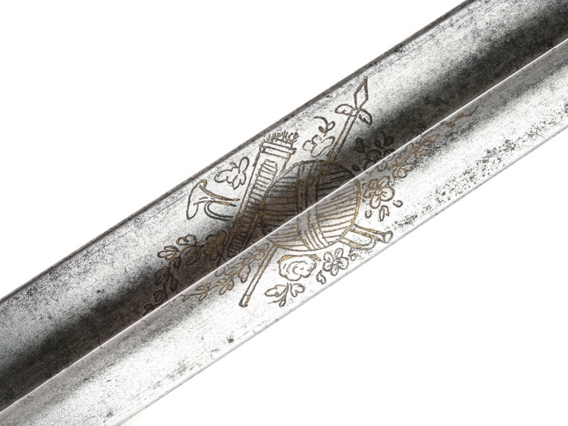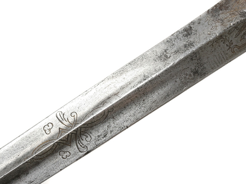 Испанский морской офицерский кортик, вероятнее всего, собранный в конце XIX века из старых оригинальных запчастей. Клинок без клейм, украшен гравированным орнаментом, рукоять из черного рога, с латунным прибором. Ножны отсутствуют.