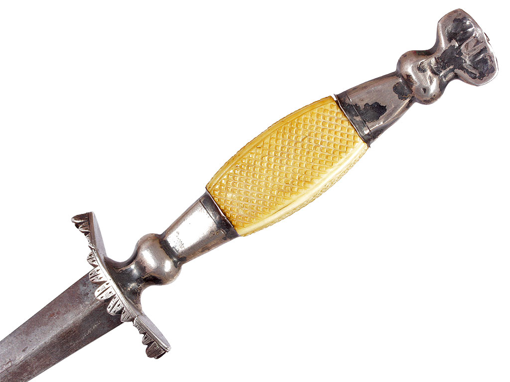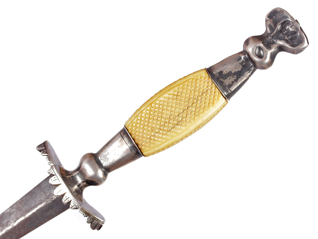 Кортик морской офицерский образца 1797 года (один из вариантов), изготовленный в начале XIX века. Клинок ромбического сечения, ничем не украшен. Без клейм. Рукоять из слоновой кости, бочкообразной формы, поверхность покрыта мелким рифлением. Прибор рукояти состоит из плоской овальной гарды с загнутым к лезвию зубчатым краем и граненого пояска, а также навершия в форме стилизованной короны. Прибор серебряный, без клейм. Ножны из серебра, гладкие, с лицевой стороны имеется шпенек с плоской шляпкой для крепления к подвесу.