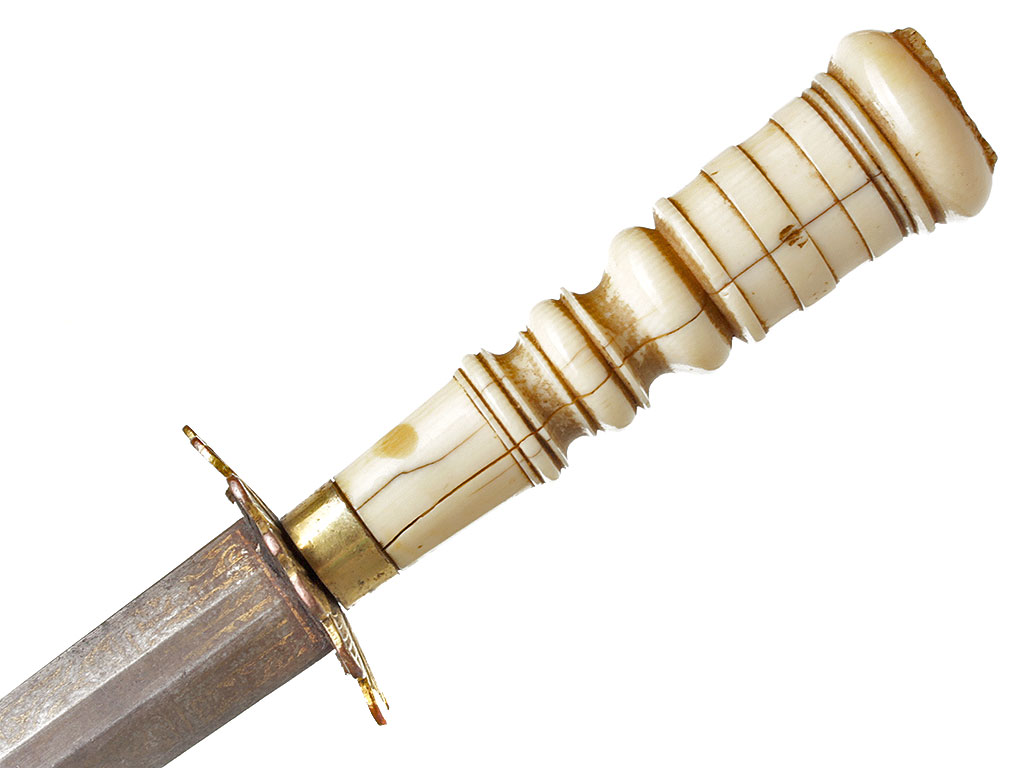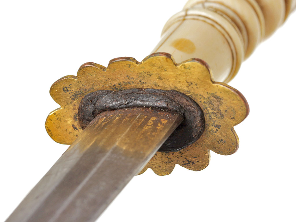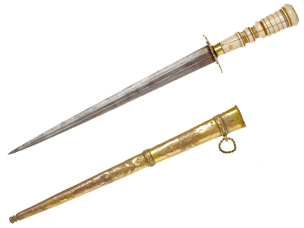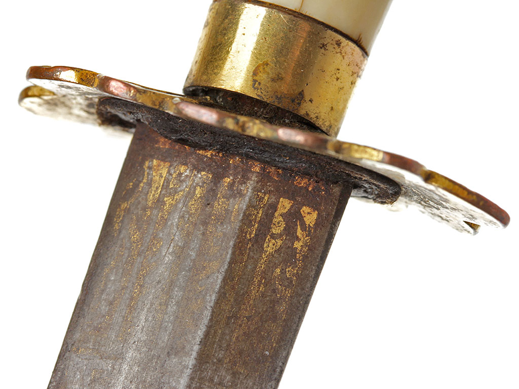 Клинок шестигранного сечения, без долов. Без клейм, в верхней четверти имеются следы наведенного золотом геометрического орнамента. Рукоять из слоновой кости, круглого сечения, с тонкими точеными рельефными поясками. Шаровидное костяное завершение рукояти отсутствует, обломано в период бытования. Прибор рукояти состоит из плоской овальной гарды и пояска. Прибор латунный, хорошо сохранилось оригинальное золочение.