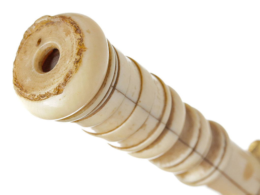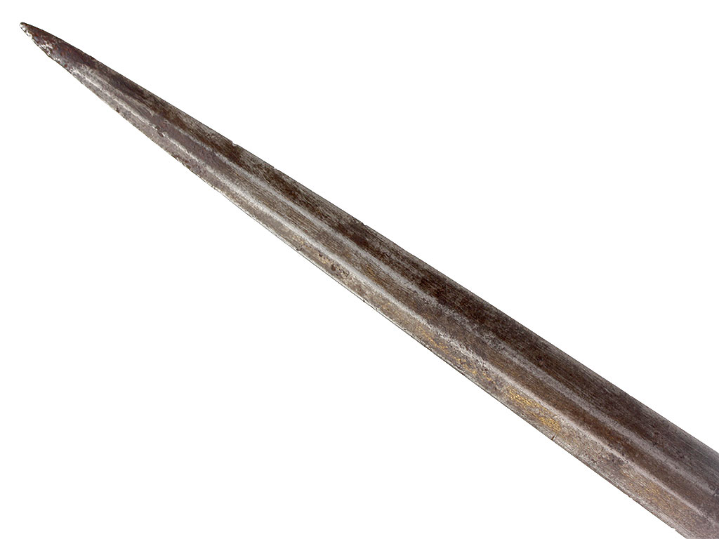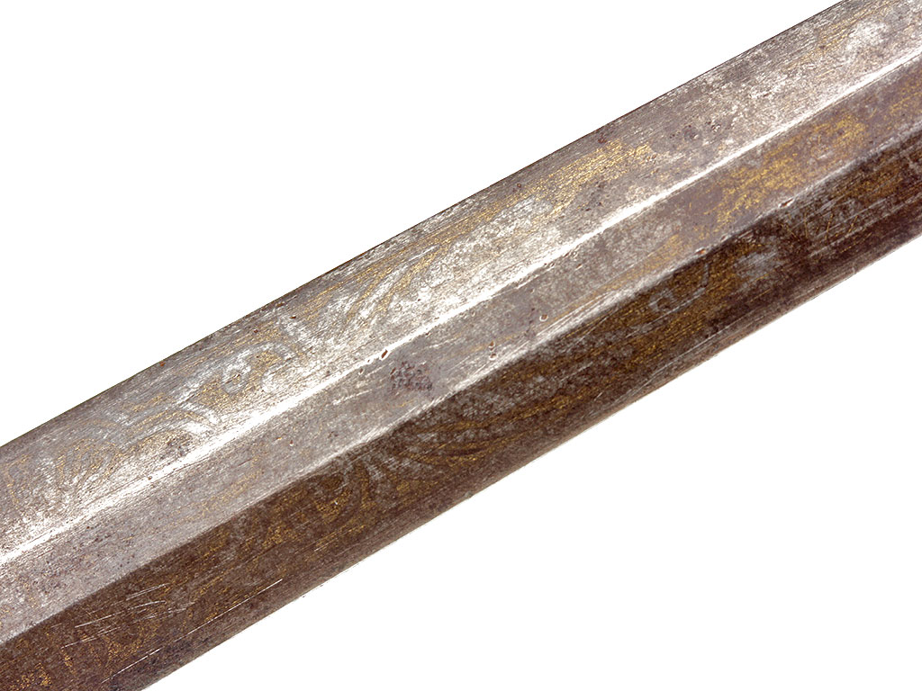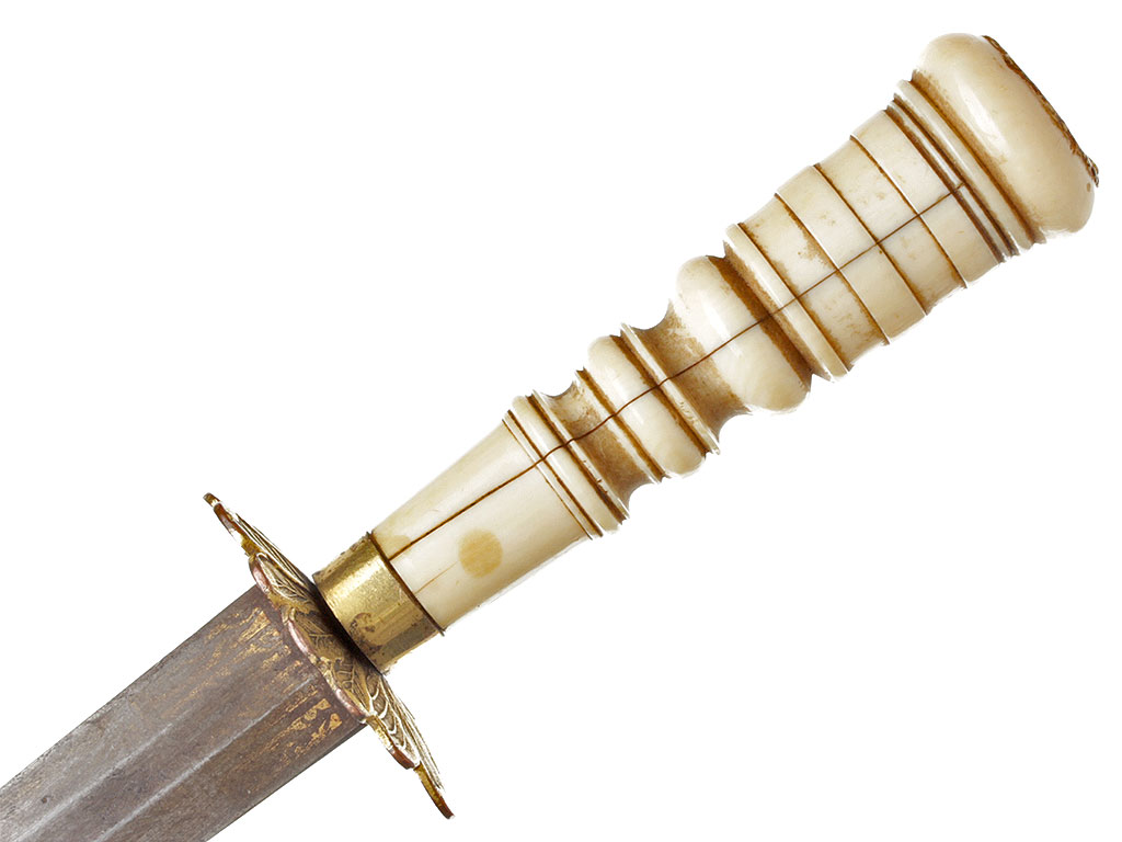 Клинок шестигранного сечения, без долов. Без клейм, в верхней четверти имеются следы наведенного золотом геометрического орнамента. Рукоять из слоновой кости, круглого сечения, с тонкими точеными рельефными поясками. Шаровидное костяное завершение рукояти отсутствует, обломано в период бытования. Прибор рукояти состоит из плоской овальной гарды и пояска. Прибор латунный, хорошо сохранилось оригинальное золочение.