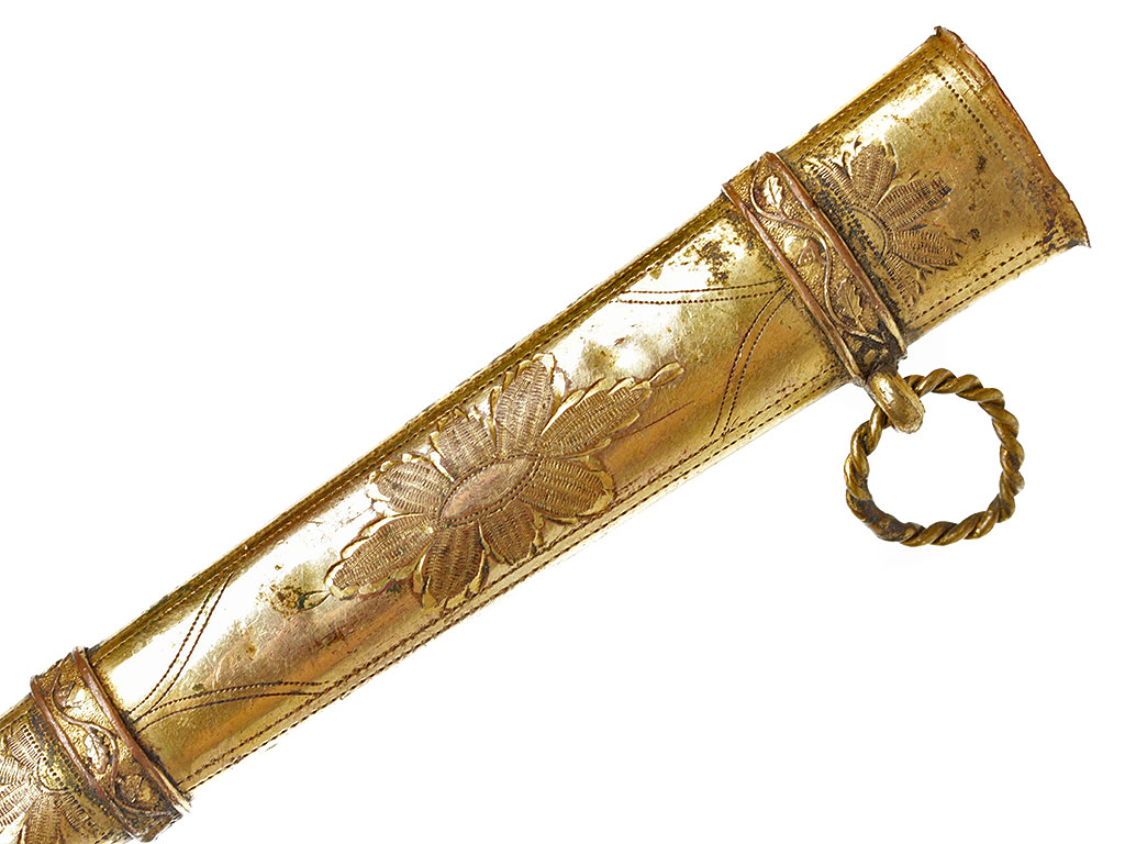 Ножны латунные, золоченые, с лицевой стороны украшены гравированным орнаментом. Имеют две гайки с сохранившимся верхним кольцом для крепления к портупее.
