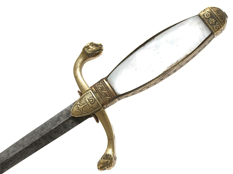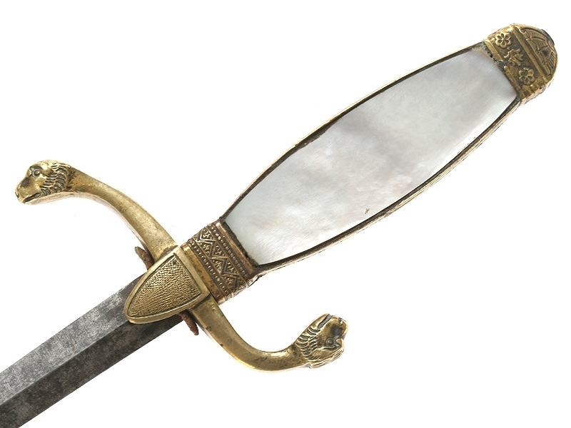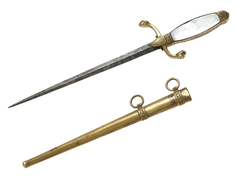Кортик морской офицерский начала XIX века, периода Первой Империи. Клинок без клейм, ничем не украшенный, щечки рукояти из перламутра, с латунным прибором, частично сохранившим оригинальное золочение. Ножны латунные золоченые.