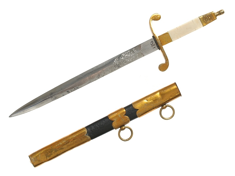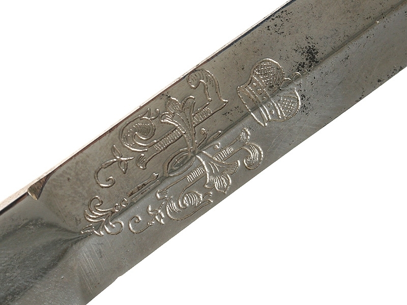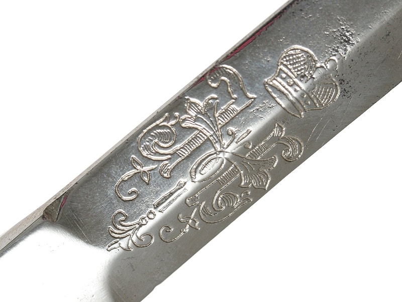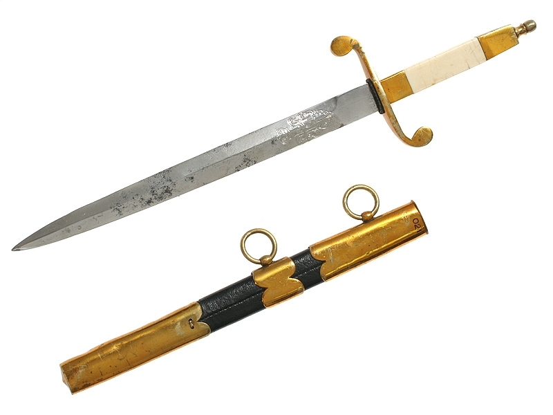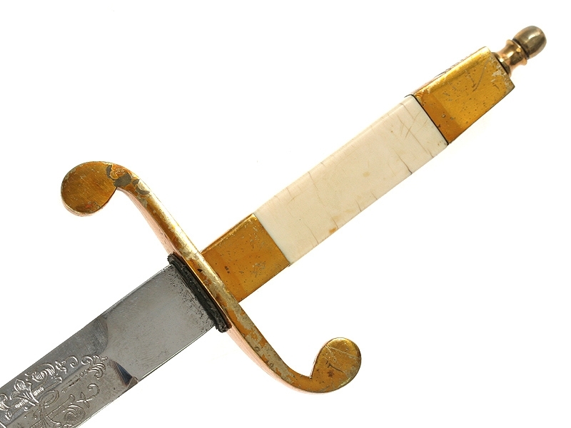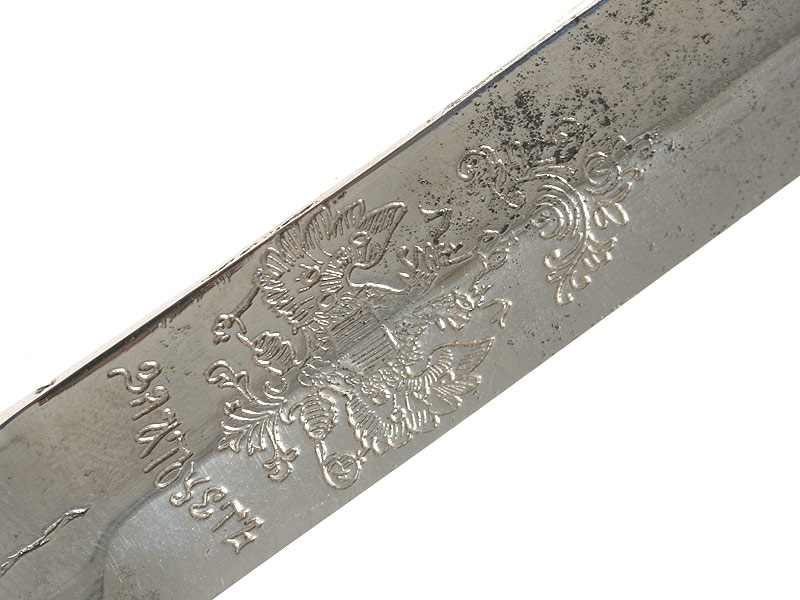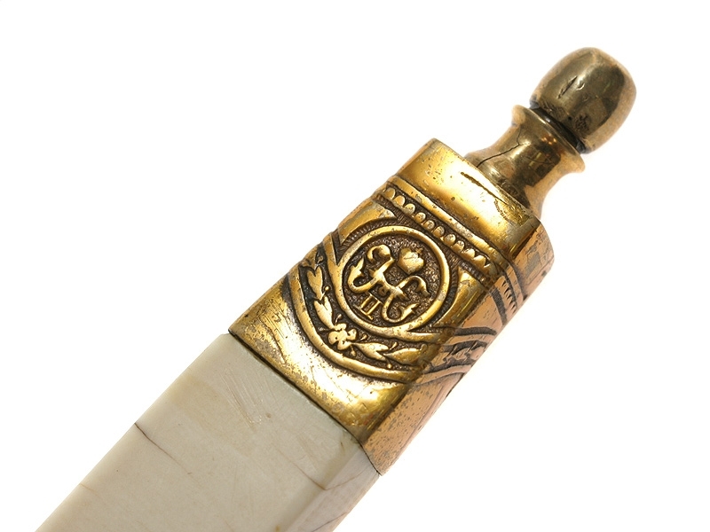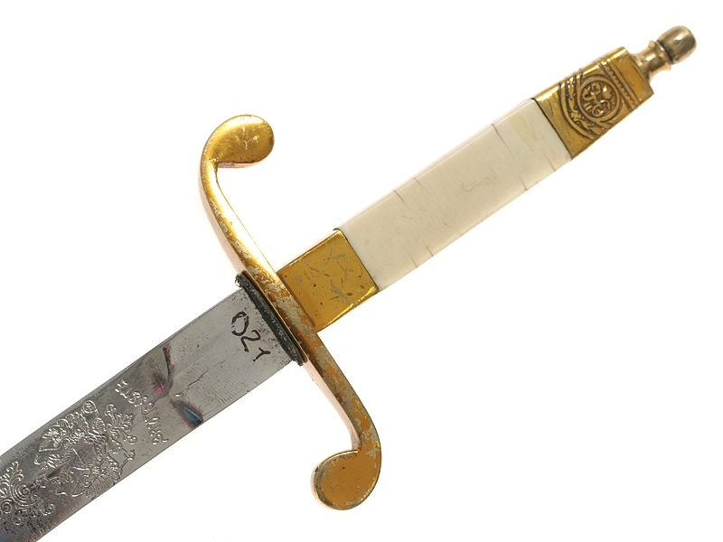 Офицерский морской кортик образца 1914 года. Клинок никелированный, украшен гравированным вензелем императора Николая II и гербом Российской Империи, под которым выгравирована надпись "Златоустъ". Рукоять из слоновой кости, на верхней втулке - вензель Императора Николая II, в правление которого владелец кортика был произведен в офицеры. Ножны деревянные, обтянуты черной кожей, все элементы прибора ножен и рукояти изготовлены из бронзы, покрытой в более позднее время лаком.