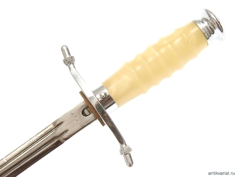 Рукоять из пластмассы белого цвета с никелированными навершием и гардой.