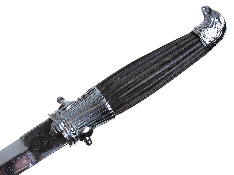 Кортик офицера Королевских военно-воздушных сил Венгрии образца 1932 года. Клинок никелированный, без клейм. Рукоять деревянная, с продольными желобками; имеются остатки черного красочного покрытия. Металлический прибор рукояти изготовлен из никелированной латуни, гарда опилена ветераном, накладное изображение орла отсутствует. У основания рукояти - кнопка фиксатора. Ножны латунные никелированные, с лицевой стороны у основания украшены рельефным изображением герба Королевства Венгрии.
