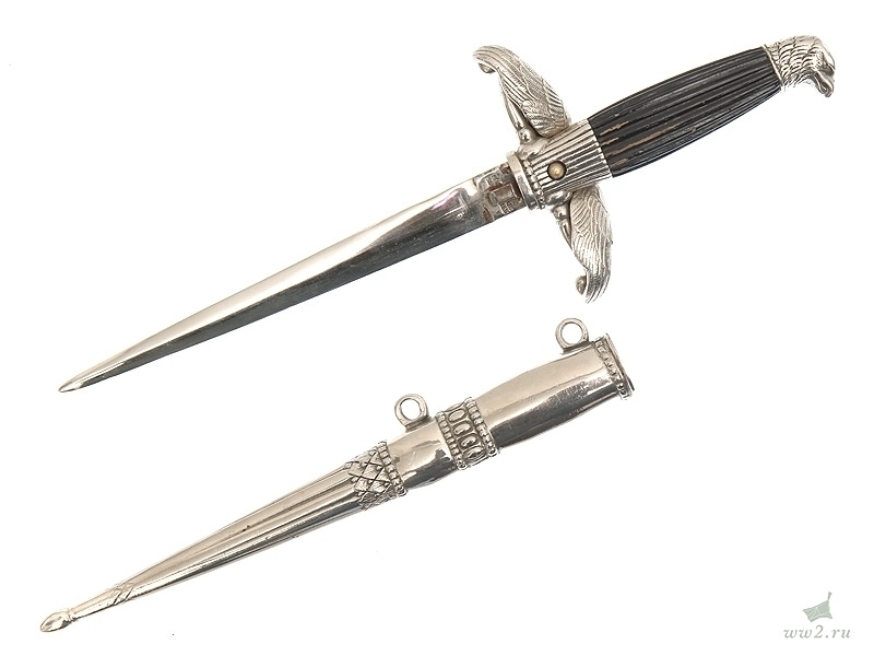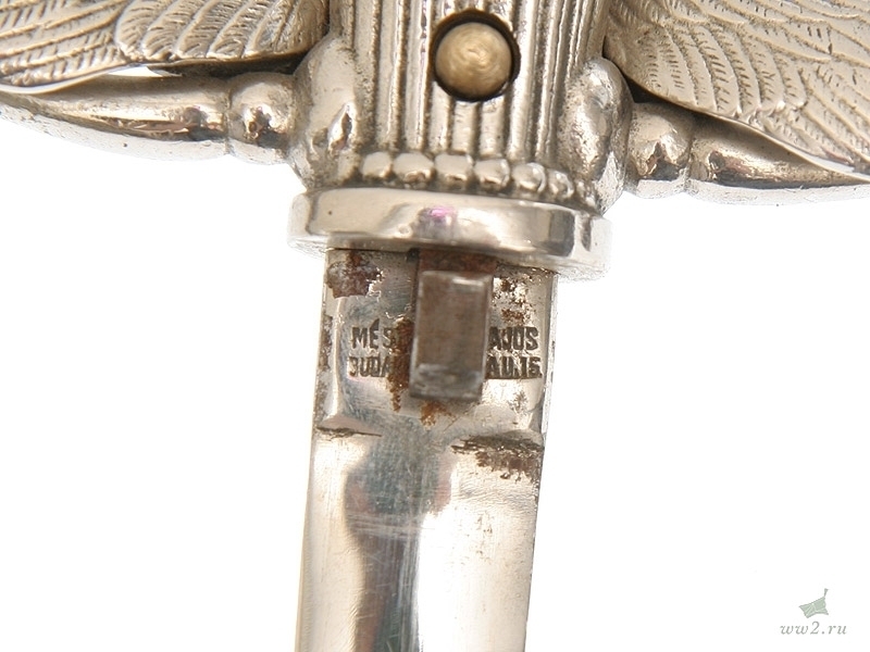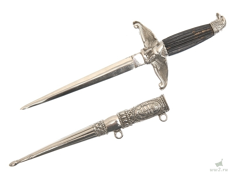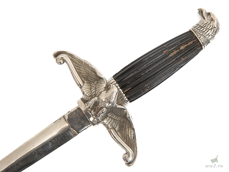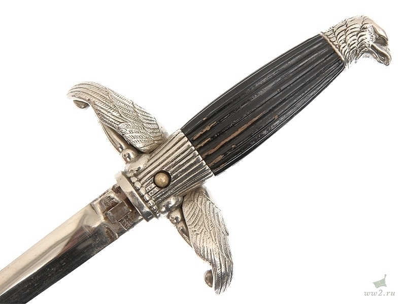 Кортик офицера Королевских военно-воздушных сил Венгрии образца 1932 года. Клинок никелированный, с клеймом фирмы-изготовителя у основания. Ножны и металлический прибор рукояти изготовлен из никелированного металла. Очень хорошее состояние.