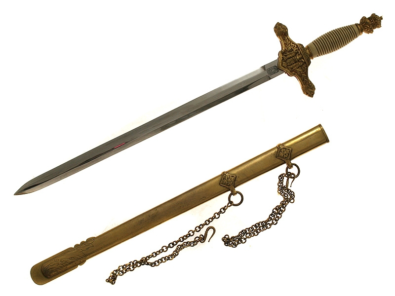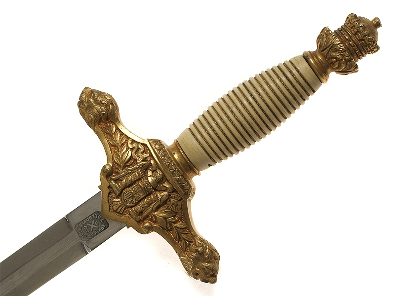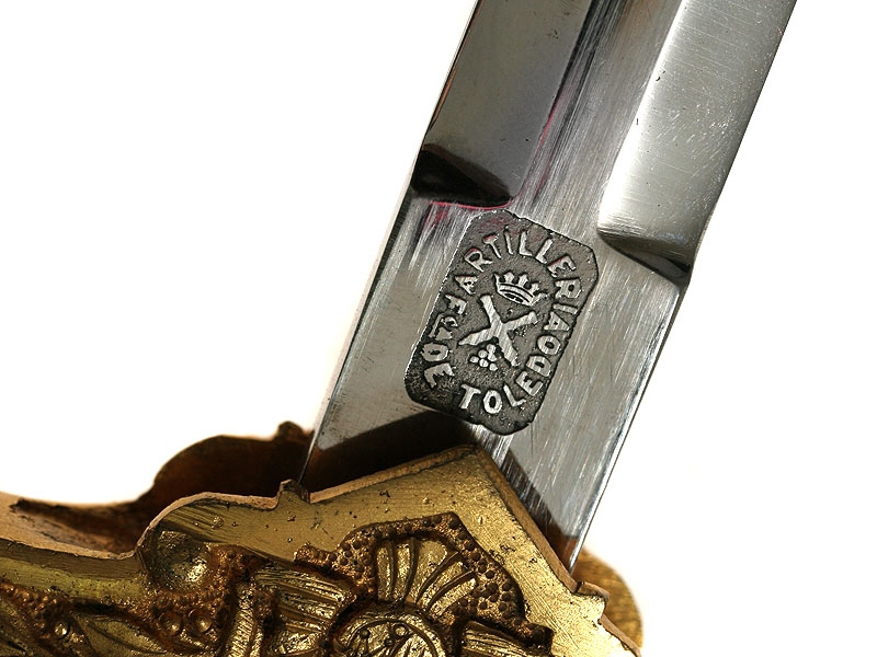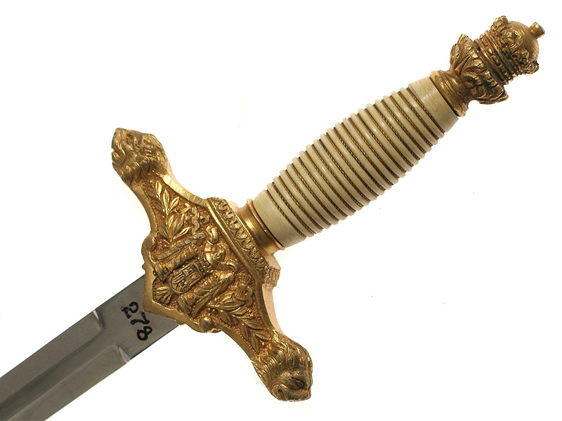 Кортик офицерский образца 1938 года. Клинок никелированный, с клеймом "Artilleria F-ca de Toledo". Рукоять из желтой пластмассы, навершие и гарда из позолоченной латуни. Гарда украшена рельефным изображением герба Испании. Ножны латунные позолоченные, с подвесом из двух золоченых цепочек.