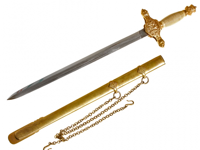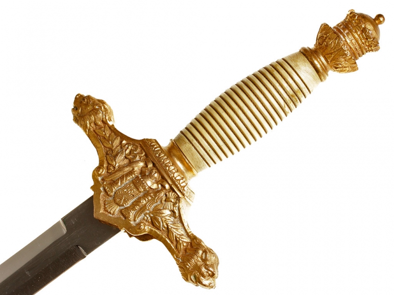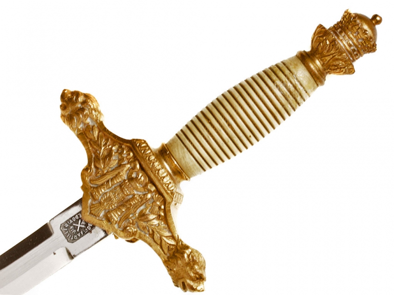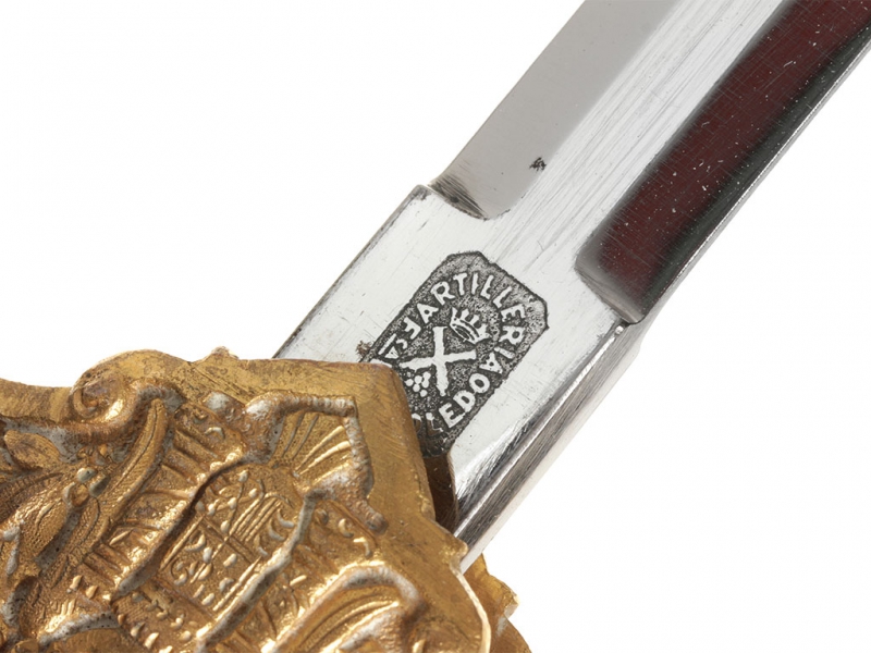 Кортик офицерский образца 1938 года. Клинок никелированный, с клеймом "Artilleria F-ca de Toledo". Рукоять из желтой пластмассы, навершие и гарда из позолоченной латуни. Гарда украшена рельефным изображением герба Испании. Ножны латунные позолоченные, с подвесом из двух золоченых цепочек.