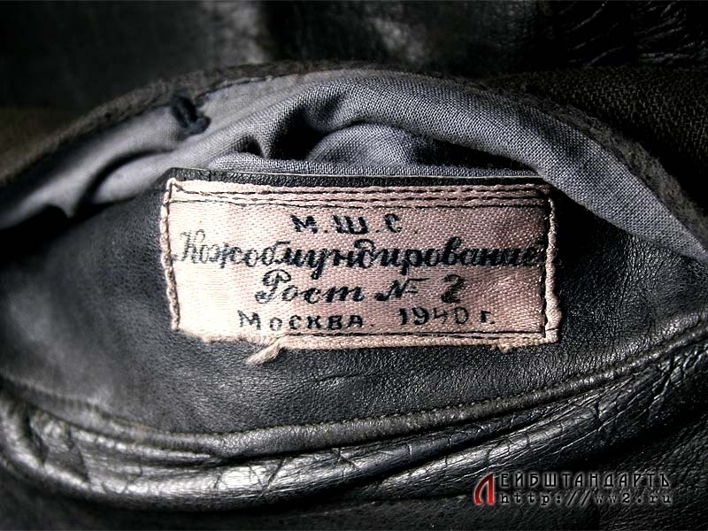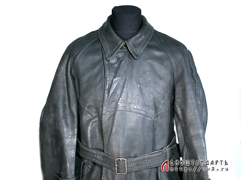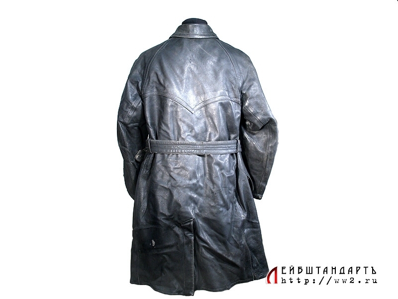 Кожаное лётное пальто, без знаков различия. На внутреннем кармане пришита бирка фирмы производителя и дата выпуска - 1940 год. Пальто с пристежной зимней подкладкой (на фото подкладка не показана). Состояние хорошее, но нуждается в чистке и уходу за кожей.