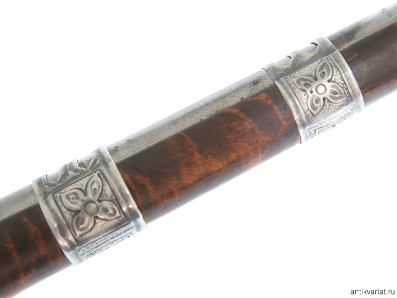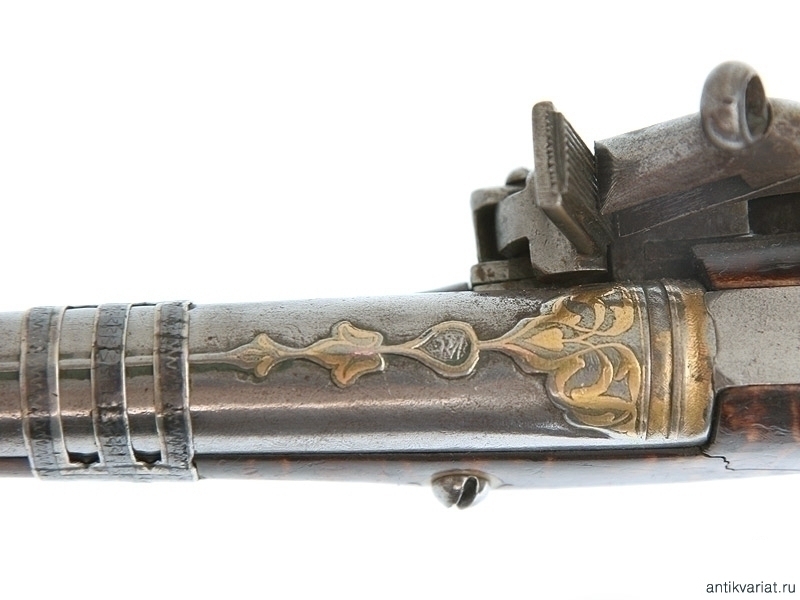 Кремневый кавказский пистолет выпуска 1830-х - 1840-х годов. Общая длина - 44,3 см. Ствол украшен орнаментом с золотой насечкой, имеется клеймо мастера. Набалдашник рукояти из слоновой кости, дерево красивой "тигровой" расцветки. Замок кремневый черкесского типа. Отличное состояние.