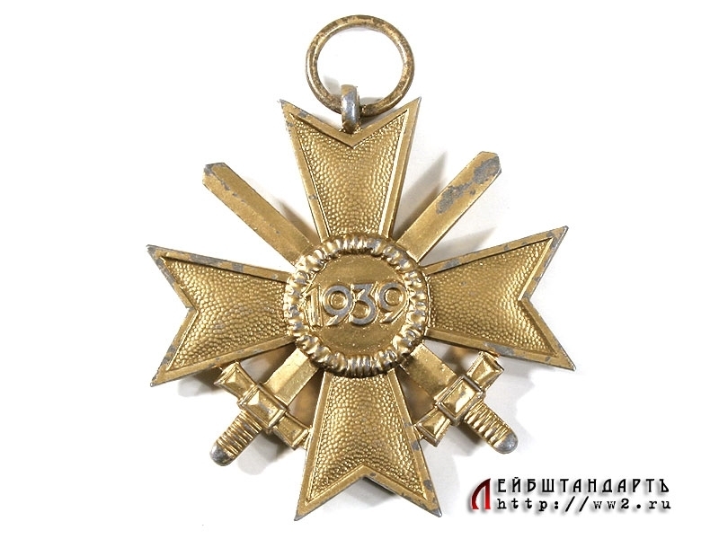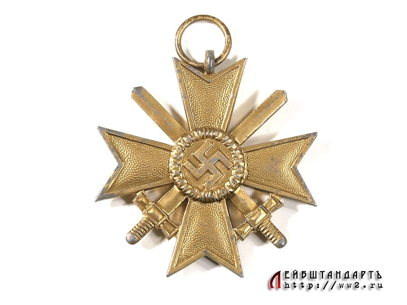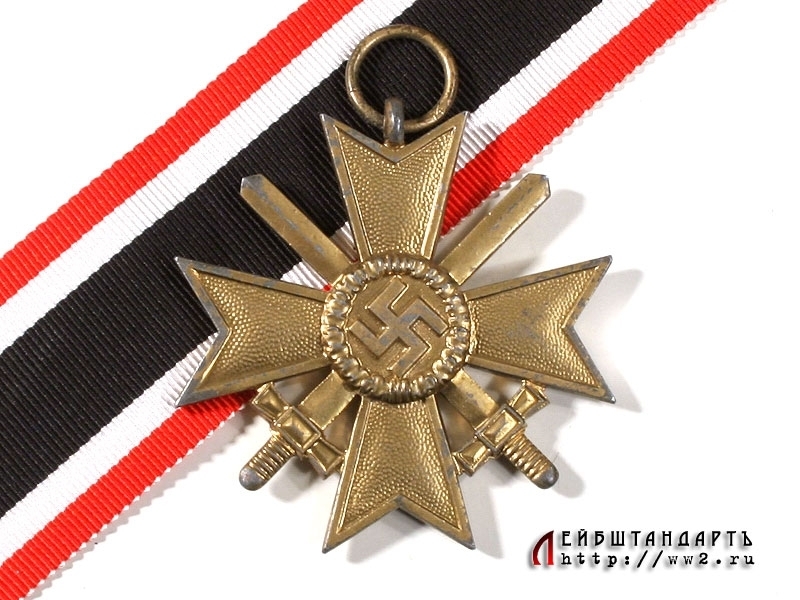 История: “Kriegsverdienstkreuz I mit Schwertern”. Крест за боевые заслуги был учрежден 18 октября 1939 года. Существовало два класса данной награды, оба класса с мечами и без мечей, для награждения военнослужащих и граждан, в том числе женщин и иностранцев за образцовую службу и/или храбрость, проявленную в ходе войны, не в сражениях. Добавление мечей к награде обозначало то, что награда была дана за храбрость, а награда без мечей вручалась за службу. 19 августа 1940 года был дополнительно учрежден Рыцарский крест за боевые заслуги для награждения тех военнослужащих, которые внесли значительный вклад в военные действия, а также Медаль за боевые заслуги для награждения соотечественников и иностранных граждан за исключительную службу.