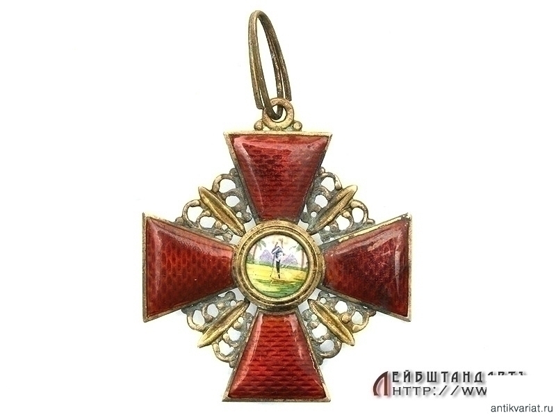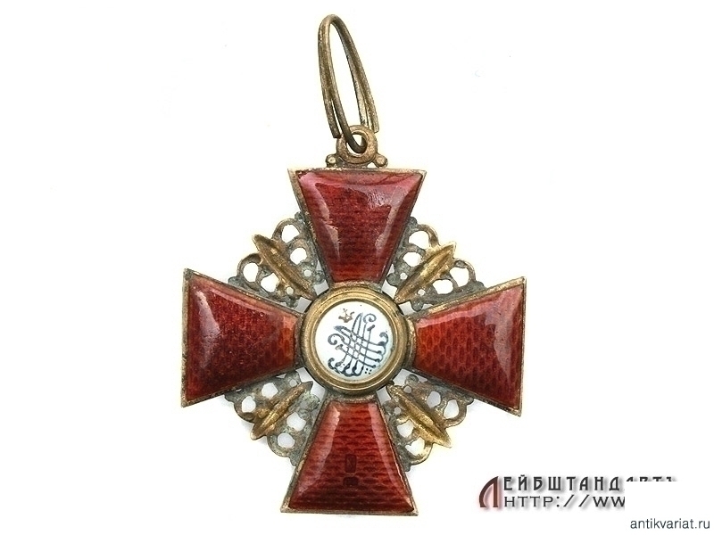 Крест ордена святой Анны без мечей 2 степени в очень хорошем коллекционном состоянии. Представляет собой крест, изготовленный из позолоченной бронзы, покрытый с обеих сторон красной эмалью по гильошированной основе. В центральном медальоне на лицевой и оборотной сторонах - изображение и вензель св.Анны. На оборотной стороне нижней лопасти под эмалью - клеймо фирмы Дмитрия Осипова в виде буквы "К" ("Капитул") и "ДО". К ушку прикреплена широкая скоба для ленты. Имеются незначительные следы поверхностного коррозийного налета, который несложно удалить.