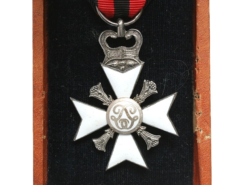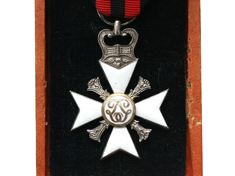 Крест Ордена Заслуг 2-й степени. Белый металл, серебрение, эмаль, на оригинальной шелковой ленте. Очень хорошее состояние, в футляре с клеймом изготовителя "Medailles D"art Fisch & Co".
