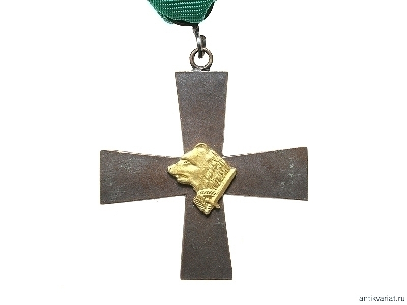 Крест Пограничной службы периода Второй мировой войны. Бронза, с накладным позолоченный изображением головы льва с мечом под ней. На оригинальной шелковой ленте.