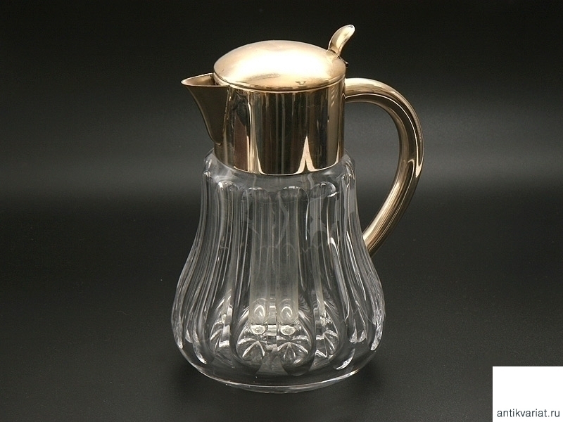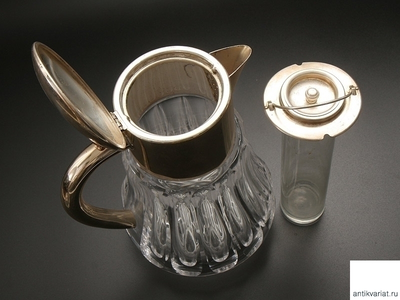 Стеклянный кувшин с высеребренной откидной крышкой и встроенной колбой для льда(для сохранения прохлады напитка). 1920-е - 1930-е годы. Отличное состояние.