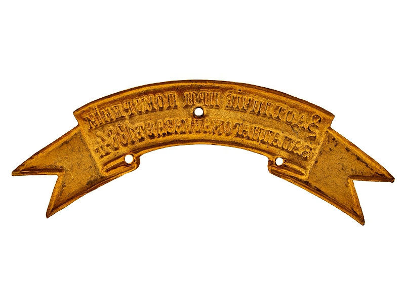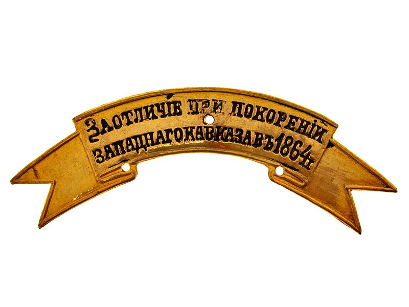 Оригинальная лента на головной убор "За отличие при покорении Западного Кавказа в 1864 году", желтый приборный металл, начало ХХ века. Латунь, золочение, в буквах - оригинальная краска. Состояние ленты - невыданная, никаких следов ношения.