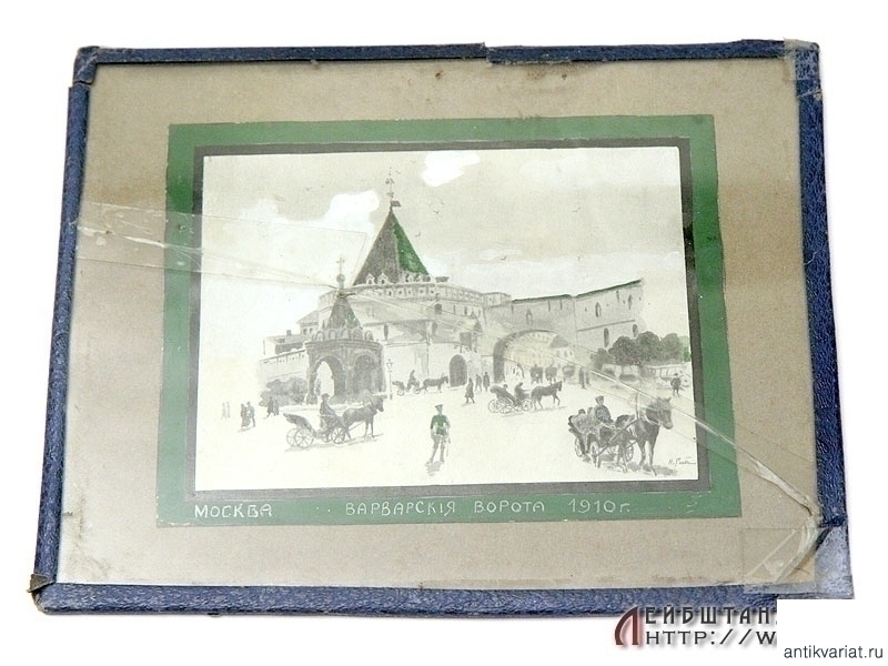 Литография с видом Варварских ворот в Москве в 1910 году. Заклеена под стеклом, на котором имеется поперечная трещина. Общий размер 22 Х 17 см.