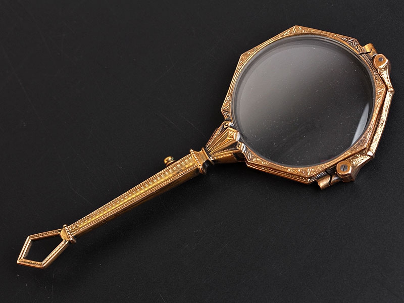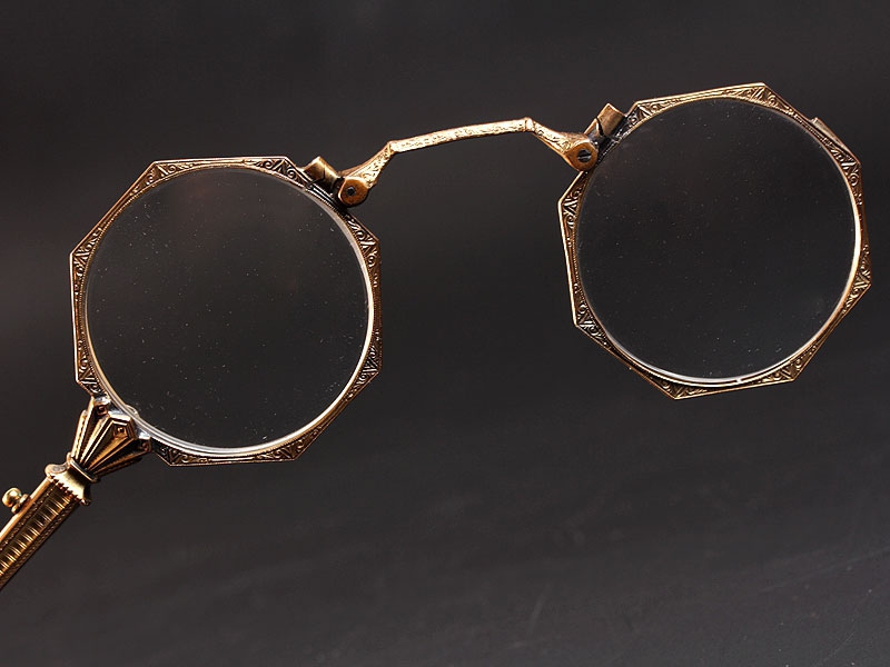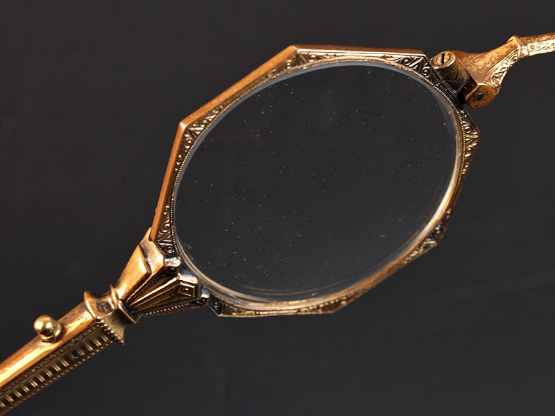 Лорнет со складывающимися линзами, с кнопочным фиксатором в рукоятке. Оправа и рукоять изготовлены из позолоченного металла.