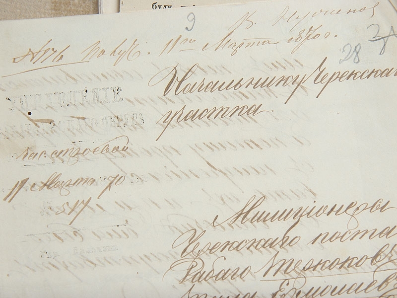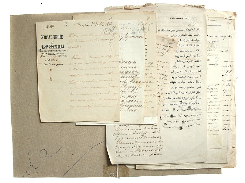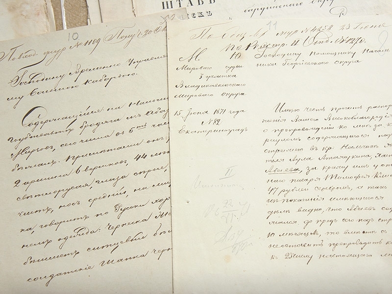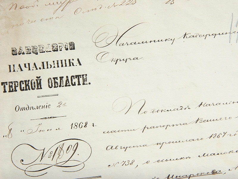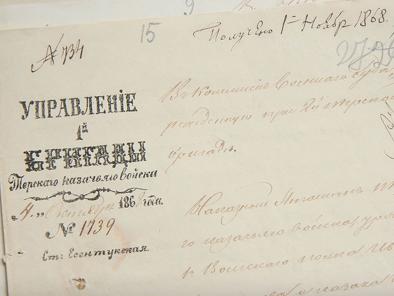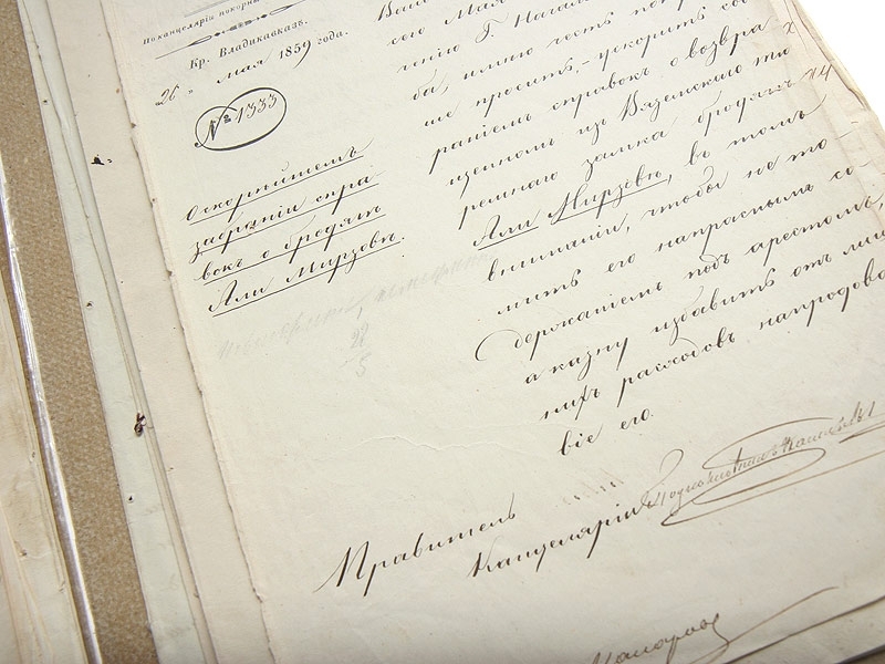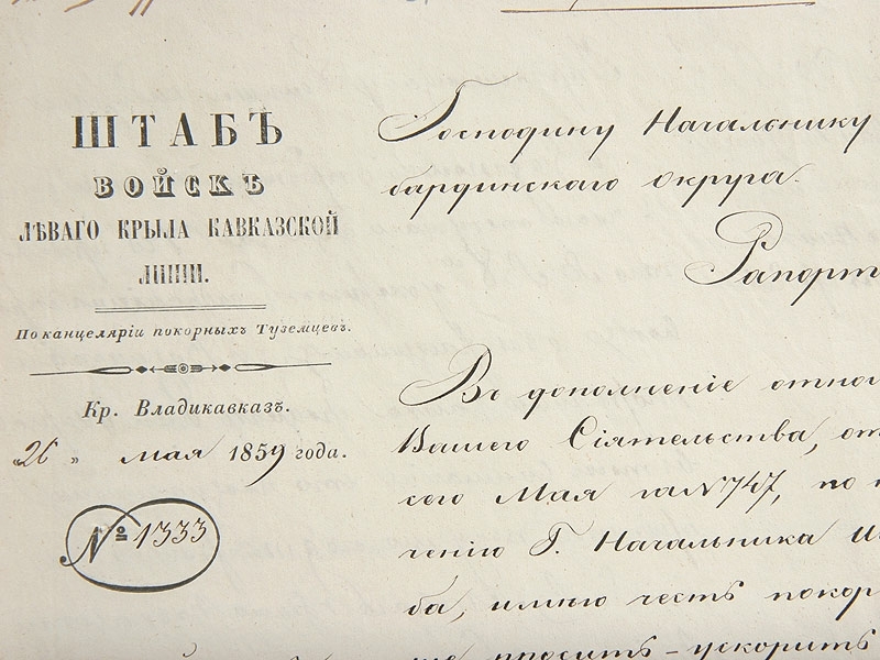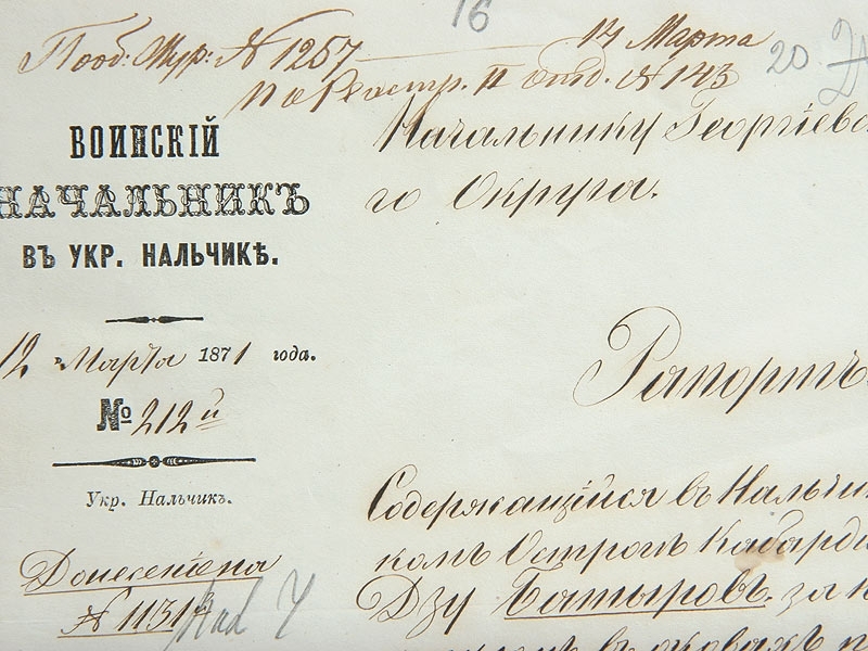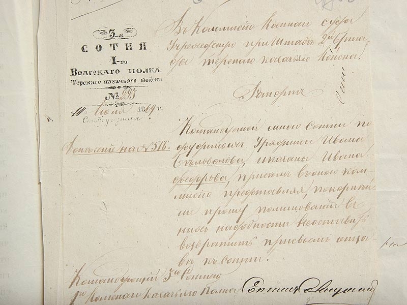 Лот из 17 архивных документов, имеющих непосредственное отношение к истории казаков на Кавказе и Кавказским войнам середины XIX века. Включает в себя Присягу для пленных воинов Шамиля на русском и арабском языках; Рапорт в Комиссию военного суда Терского казачьего войска, датированный 1869 годом; Рапорт в ту же Комиссию, датированный 1868 годом; Рапорт начальнику Черкасского участка от 11 марта 1870 года; бланк допроса арестованного; Рапорт воинскому начальнику в Нальчике от 12 марта 1871 года; Рапорт начальнику Кабардинского округа и прочие, в том числе и более ранние, документы.
