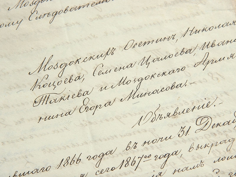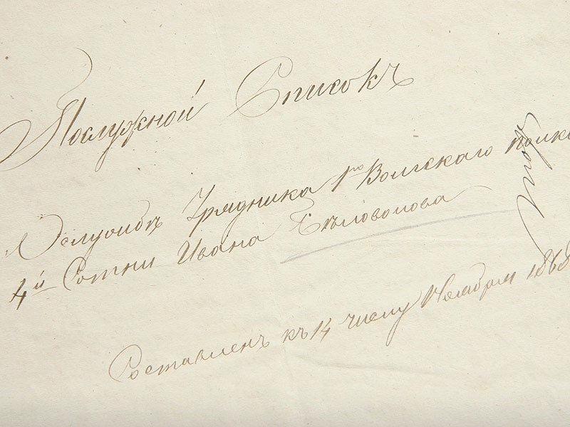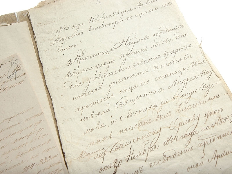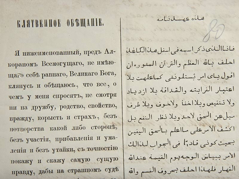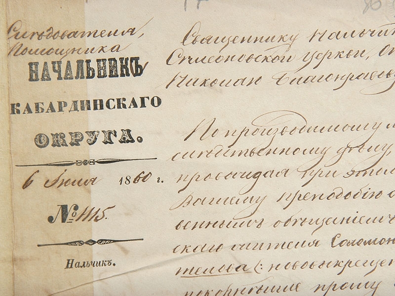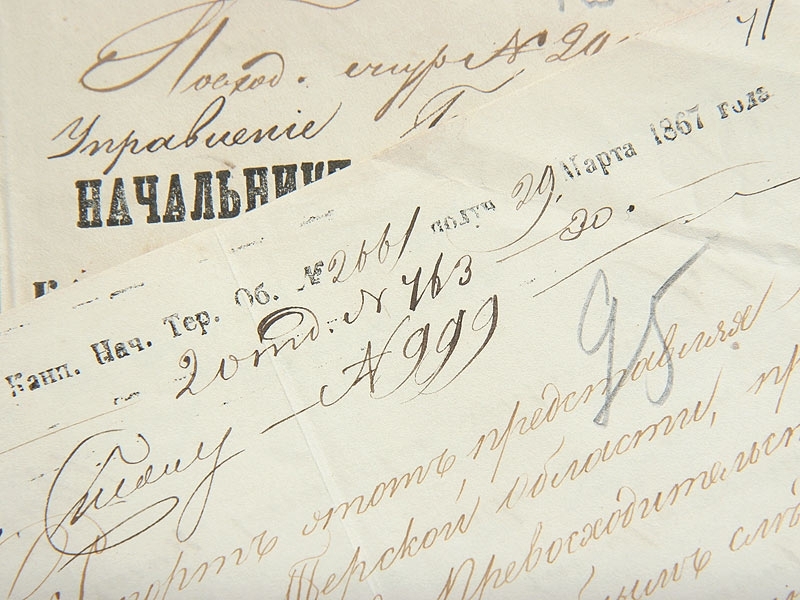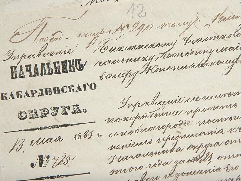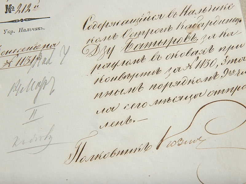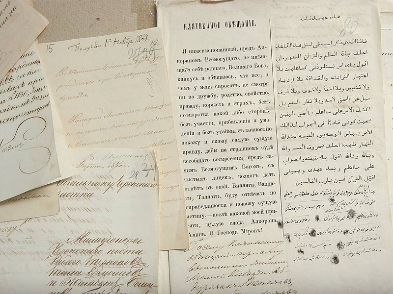 Лот из 17 архивных документов, имеющих непосредственное отношение к истории казаков на Кавказе и Кавказским войнам середины XIX века. Включает в себя Присягу для пленных воинов Шамиля на русском и арабском языках; Рапорт в Комиссию военного суда Терского казачьего войска, датированный 1869 годом; Рапорт в ту же Комиссию, датированный 1868 годом; Рапорт начальнику Черкасского участка от 11 марта 1870 года; бланк допроса арестованного; Рапорт воинскому начальнику в Нальчике от 12 марта 1871 года; Рапорт начальнику Кабардинского округа и прочие, в том числе и более ранние, документы.