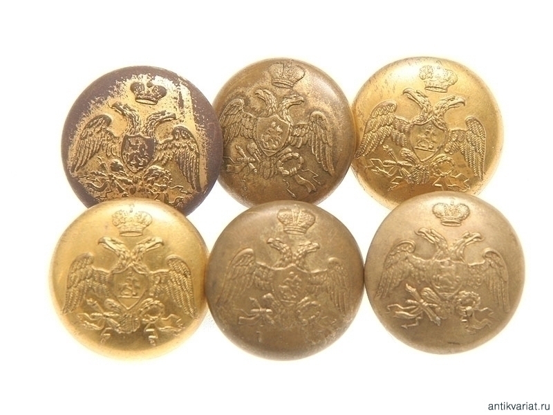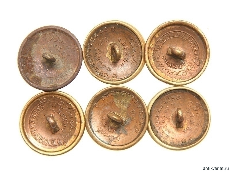 Лот из шести позолоченных гвардейских офицерских пуговиц на период правления Николая I. Фирма "Бр.Бухъ" в Санкт-Петербурге.