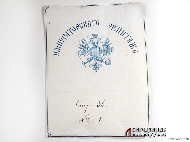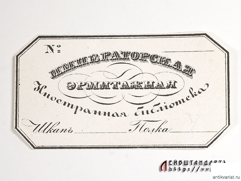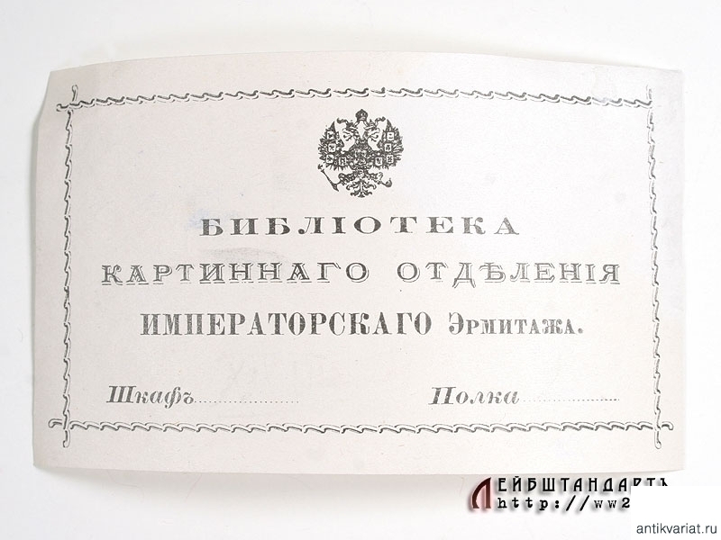 Лот из четырех дореволюционных экслибрисов различных отделов Императорского Эрмитажа в отличной сохранности. Присутствуют общий экслибрис с императорским гербом, экслибрис Иностранной библиотеки, картинного отделения и наклейка.