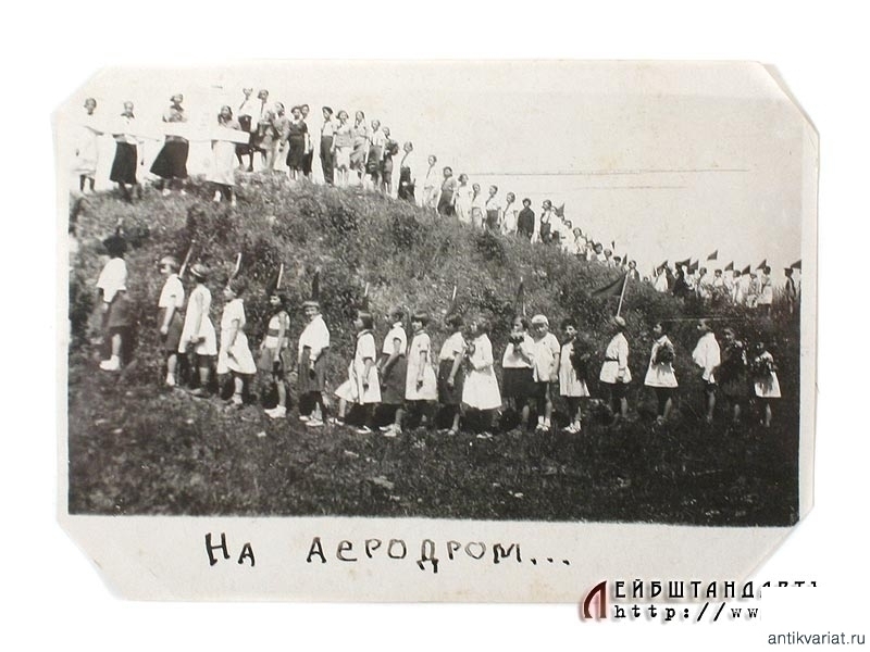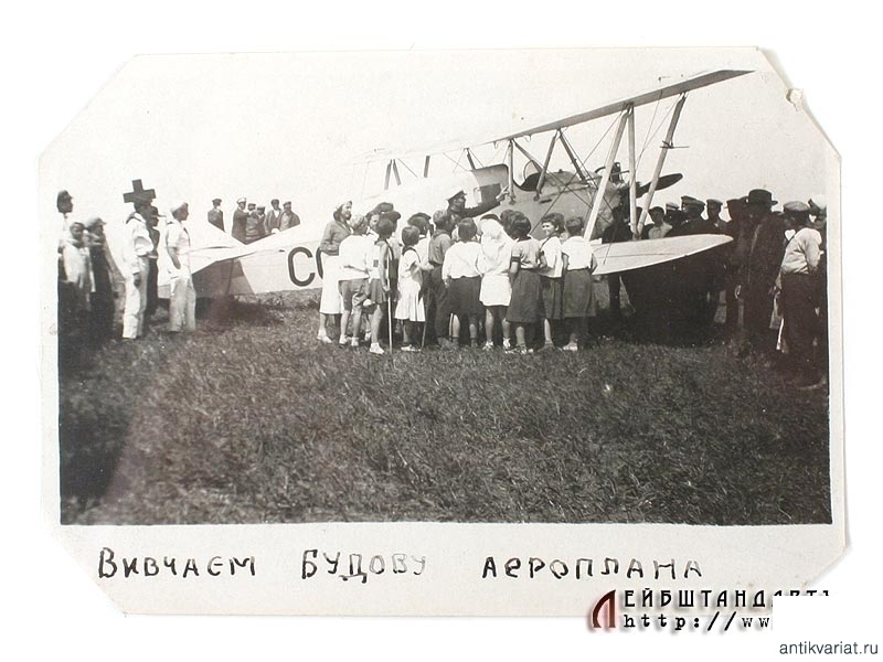Лот из двух фотографий 1930-х годов, изображающих пионеров за изучением авиационной техники. Предназначались, вероятнее всего, для стенгазеты: внизу фотографий имеются подписи на украинском языке. Очень хорошее состояние.