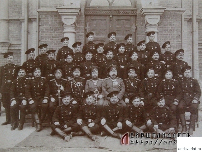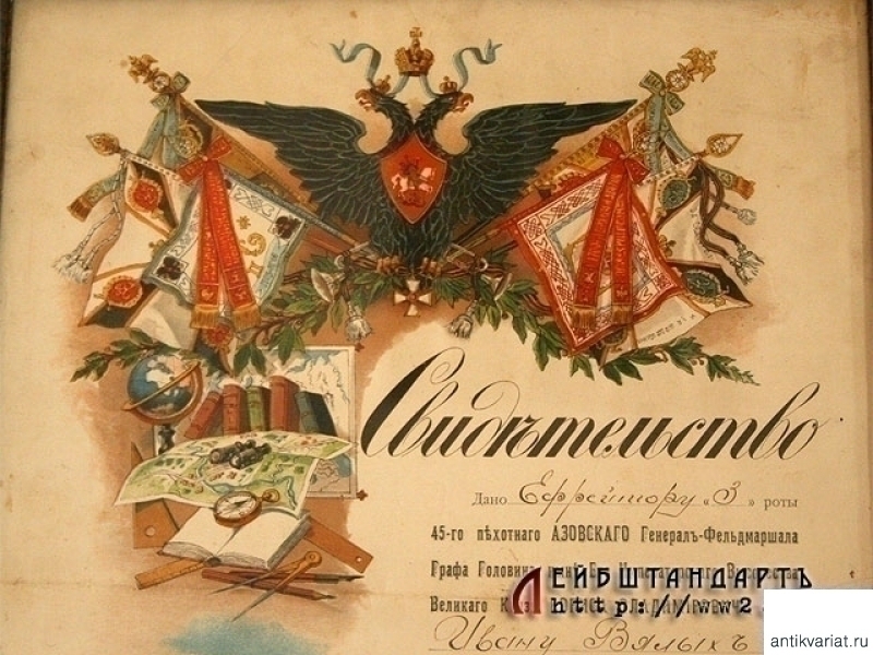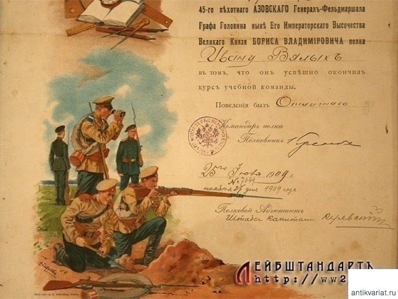 Лот из двух предметов: Свидетельство, данное ефрейтору 3 роты 45 пехотного Азовского Генерал-Фельдмаршала Графа Головина, впоследствии Его Императорского Высочества Великого Князя Бориса Владимировича полка Ивану Вялых в том, что он успешно окончил курс учебной команды 25 июня 1909 года, и групповое фото, на котором несомненно присутствует владелец данного документа. Оба документа пришли из одной семьи, и мы не стали их разделять. Фотография крупноформатная, очень хорошего качества, у присутствующих на ней нижних чинов видны полковые знаки данного полка и медали, а у офицеров, кроме крестов и медалей, присутствуют еще и наградные шейные знаки. Стоящий слева на фото унтер-офицер служил ранее в одной из гвардейских частей, о чем свидетельствует знак на его груди.
