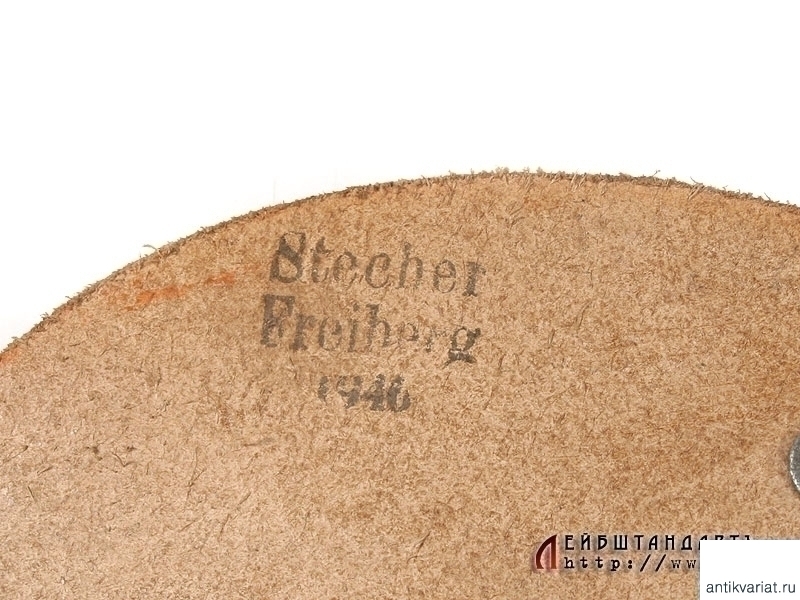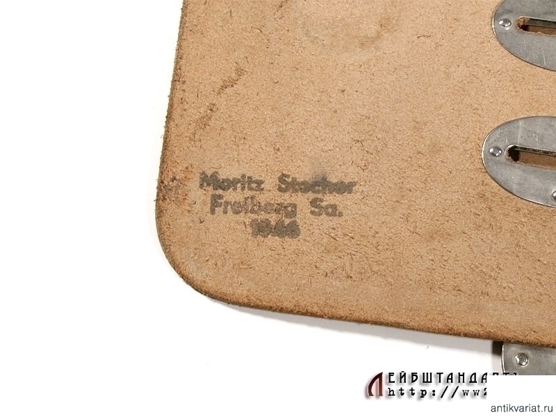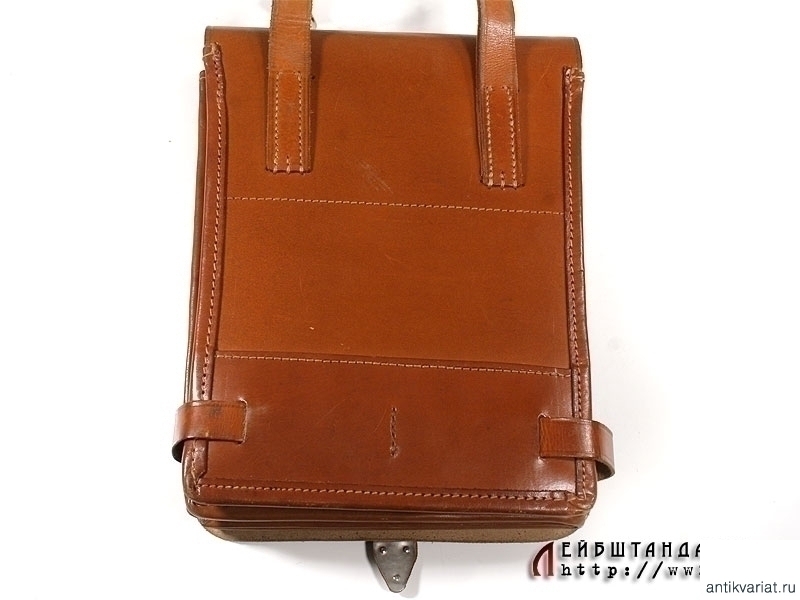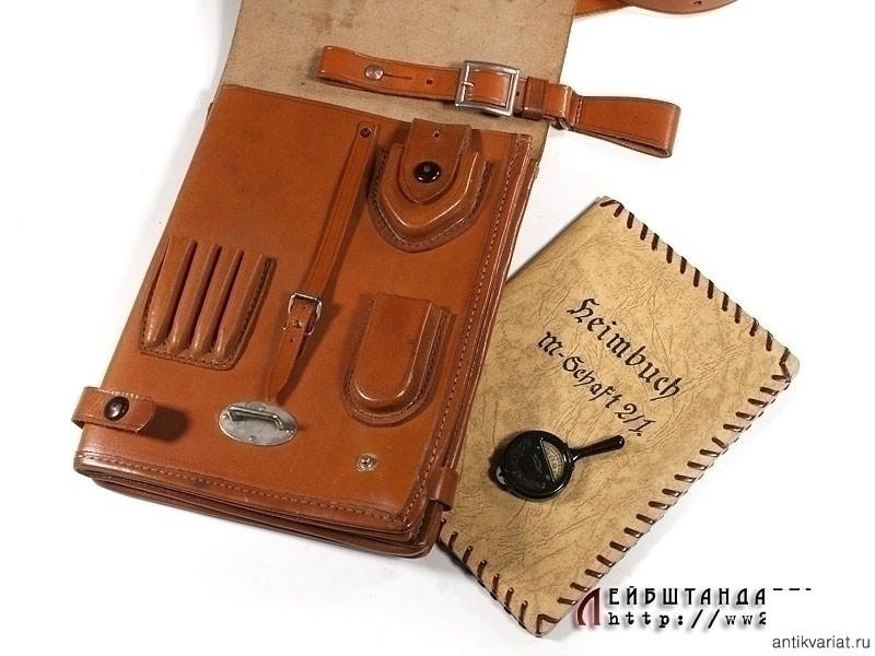Лот из полевого офицерского планшета и кобуры для револьвера Наган, изготовленных в 1946 году в Германии на заказ для советского офицера, служившего там в оккупационных войсках (они в тот момент так и назывались, позднее - уже после образования ГДР - были переименованы в Западную группу войск). Комплект сшит из ярко-рыжей кожи, на внутренней стороне присутствуют клейма мастерской. Внутри планшетки сохранился нетронутый ежедневник (видимо, доставшийся в свое время в качестве трофея) и старый курвиметр советского производства. Оба предмета в идеальной сохранности.