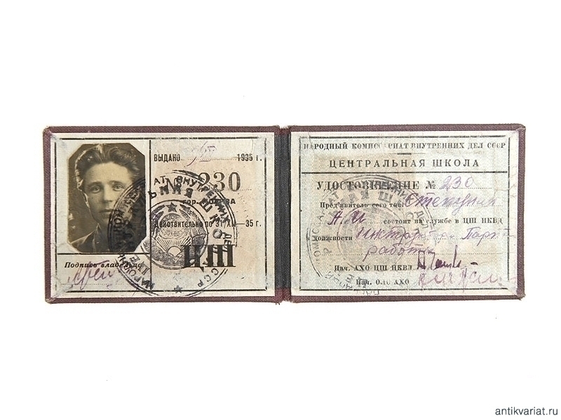 Лот из удостоверения и фотографий сотрудника Центральной Школы НКВД А.И.Степунина, состоявшего в данной школе на должности инструктора по партийной работе. Начало - середина 1930-х годов. Очень хорошее состояние. Фотографии достаточно больших размеров.