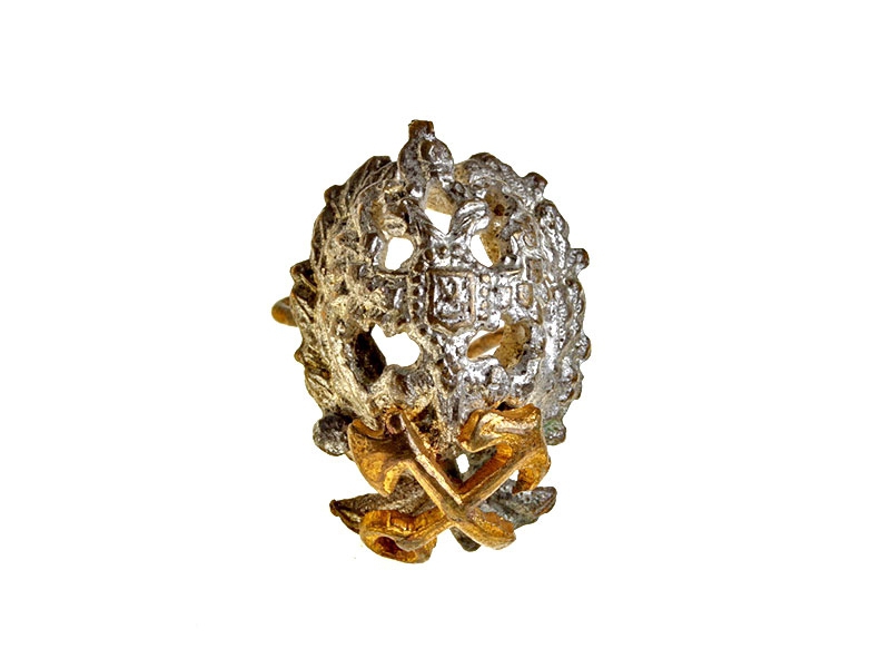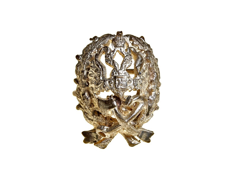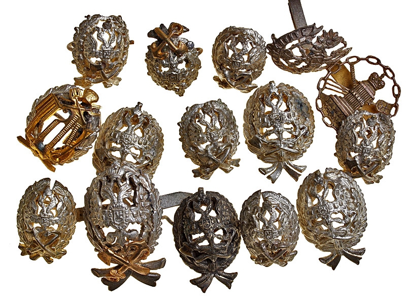 Лот оригинальных кокард на головные уборы и петличных знаков чиновников Министерства путей сообщения в количестве 14 экземпляров. Кокарды изготовлены из посеребренной латуни, классические для данного типа - с изображением орла на скрещенных топоре и якоре. Разные изготовители, одна кокарда - Закавказской железной дороги. В качестве бонуса - 1 кокарда межевого ведомства. Отличное состояние.