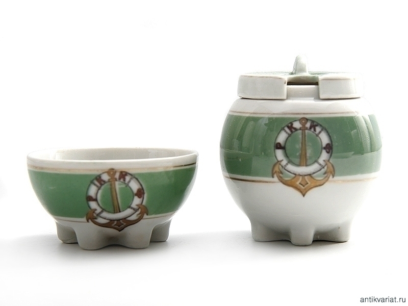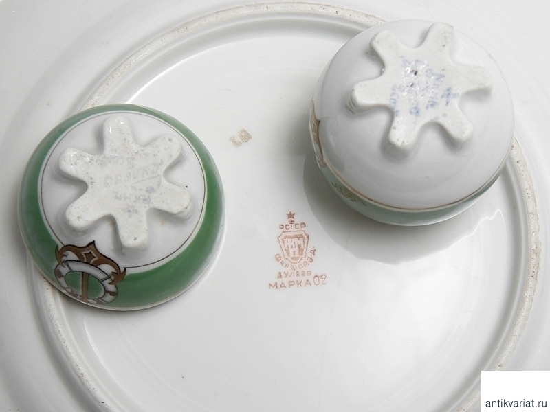 Лот фарфоровой посуды из столовой Рабоче-Крестьянского Красного Флота. Состоит из большой тарелки, молочника, горчичницы и солонки. Все предметы изготовлены на Дулевской фабрике в 1930-х годах. Очень хорошее состояние.
