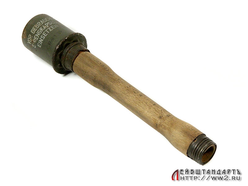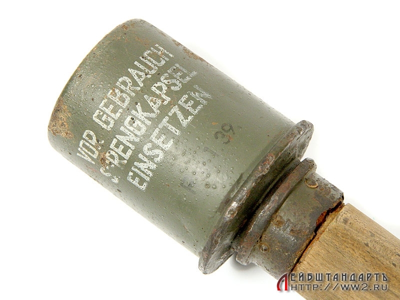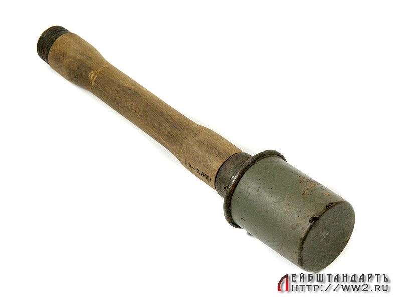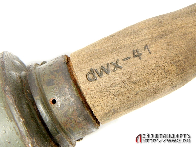 Массо-габаритный макет ручной гранаты М24. Боевая часть в очень хорошем состоянии, сохранилось оригинальное красочное покрытие с трафаретной надписью "Перед использованием вставить взрыватель", а также клейма с датой выпуска изделия. У основания присутствуют незначительные следы коррозии. Ручка деревянная, превосходно сохранилась, отсутствует только нижний колпачок. Полностью разряжена.