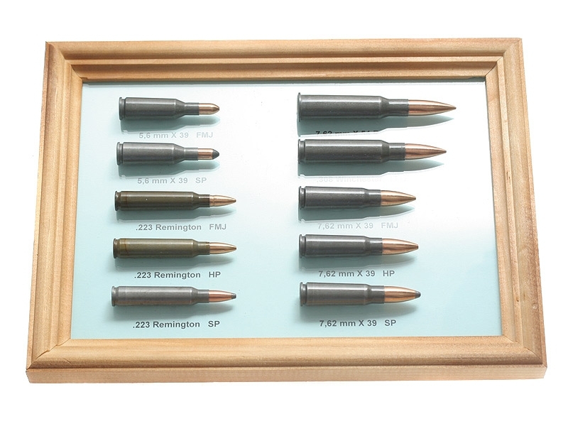 Макеты различных винтовочных патронов, оформленные в рамку.