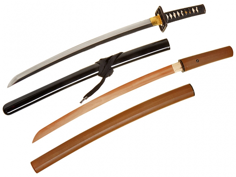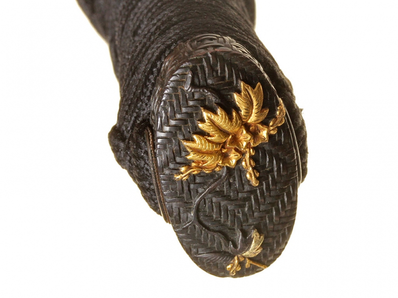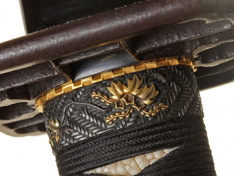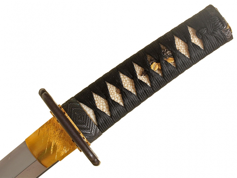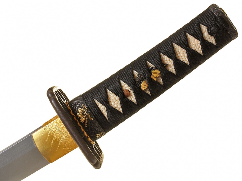 Короткий самурайский меч вакидзаси, изготовленный мастером Дайдзё Фудзивара Тадакуни, провинция Харима (Хизэн) в 1650 году. Клинок с выраженной линией закалки, хамон сугу-ха, хвостовик подписан мастером и имеет одно крепежное отверстие. Рукоять деревянная, обтянутая кожей ската, оплетена тесьмой черного цвета. Цуба квадратной формы, изготовлена в 1780 году и имеет сертификат NBTHK. Необходимо отметить, что употребление квадратных цуб самураями было запрещено в начале XIX века очередным "законом против роскоши". Детали оправы декорированы золочеными изображениями листьев павлонии. Ножны покрыты глянцевым черным лаком.