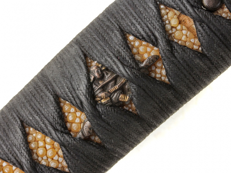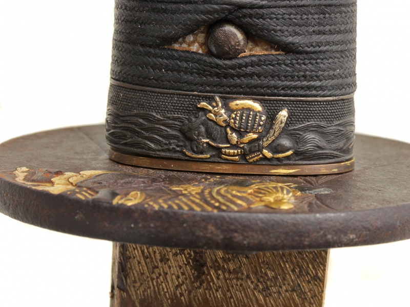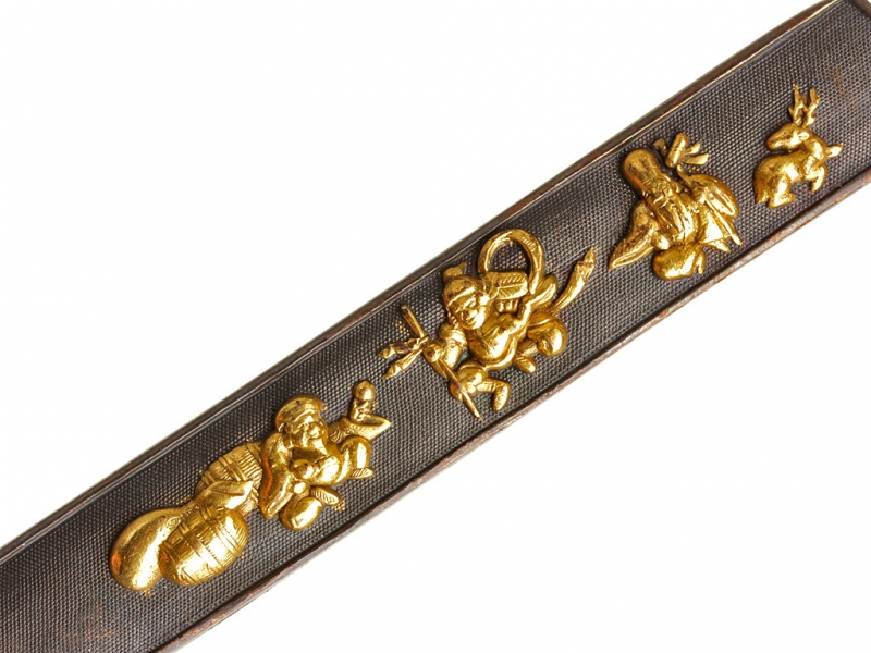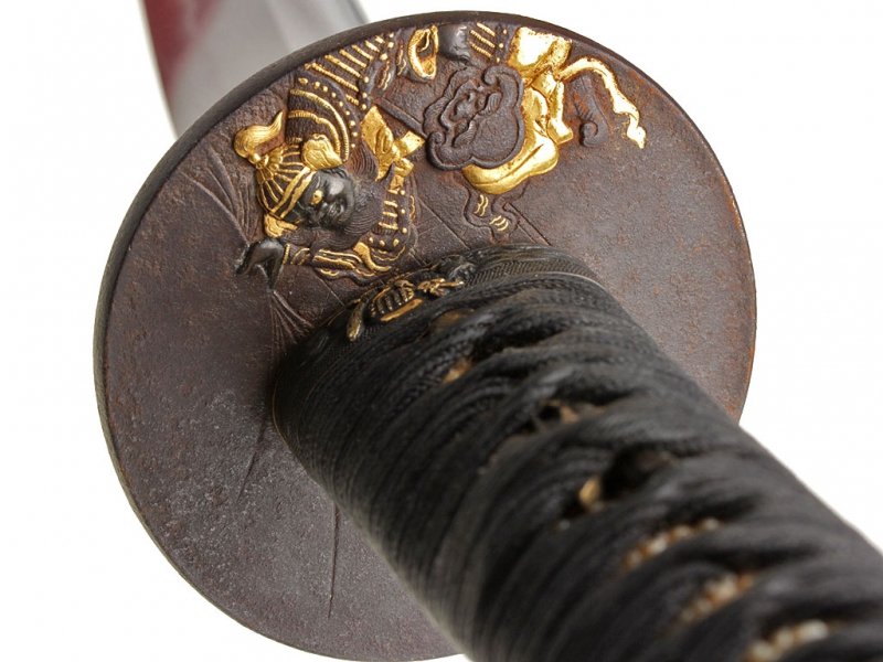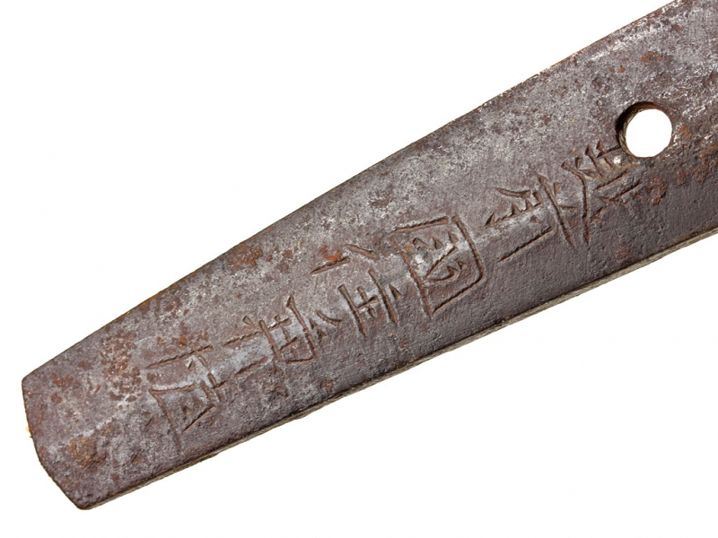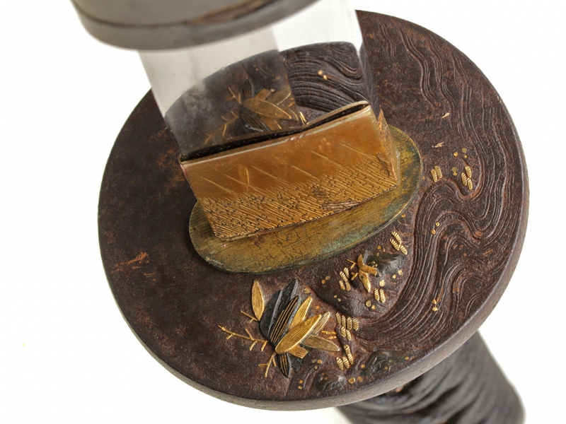 Короткий самурайский меч вакидзаси, изготовленный в период Канбун (XVII век). Клинок своей конструкцией воспроизводит форму, которая использовалась в японских алебардах - нагината. Но в данном случае не использован клинок нагината-наоси, конструкция была изначально избрана автором именно для меча. Узор клинка сугу-ни-ко-мидарэ-ха, хвостовик формы "убу", подписан мастером и имеет одно крепежное отверстие. Рукоять деревянная, обтянутая кожей ската, оплетена тесьмой черного цвета. Цуба украшена изображением горной реки и нависших над ее водами листьев бамбука - символа стойкости и упорства перед невзгодами. Касира декорирована изображением воина времен сражений между кланами Тайра и Минамото периода войны Гэмпэй. Ножны покрыты матовым черным лаком.