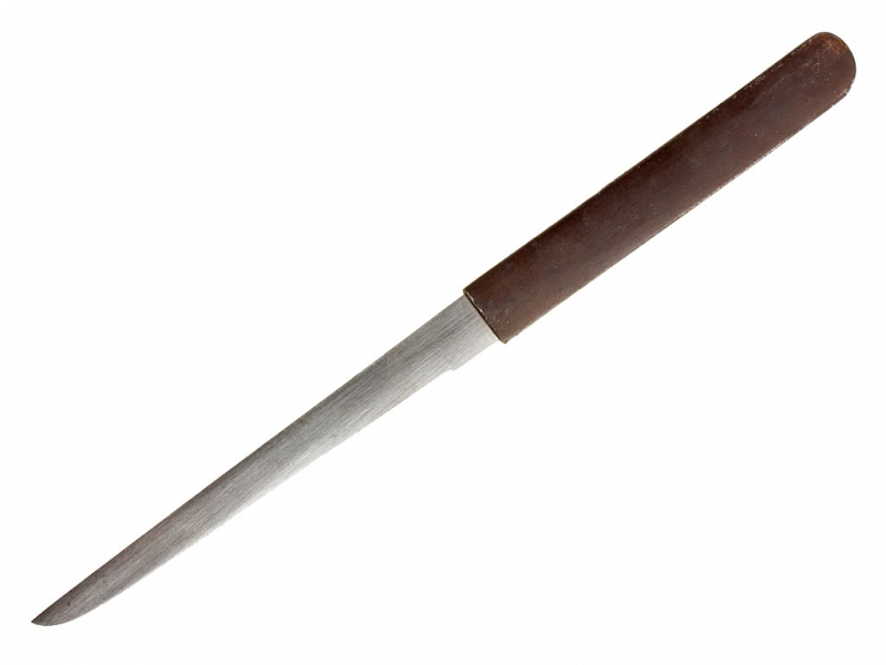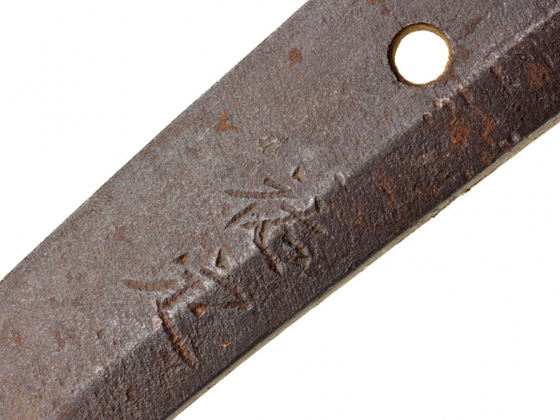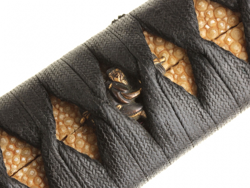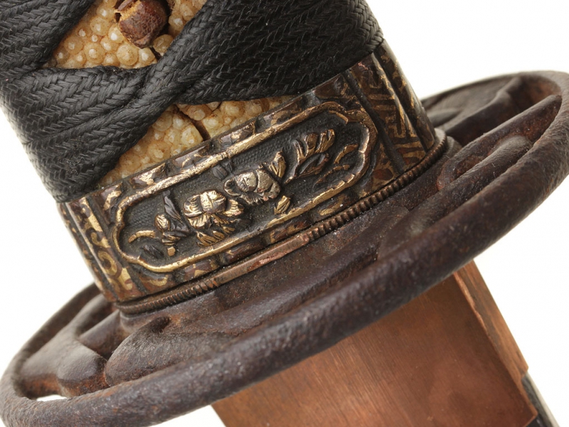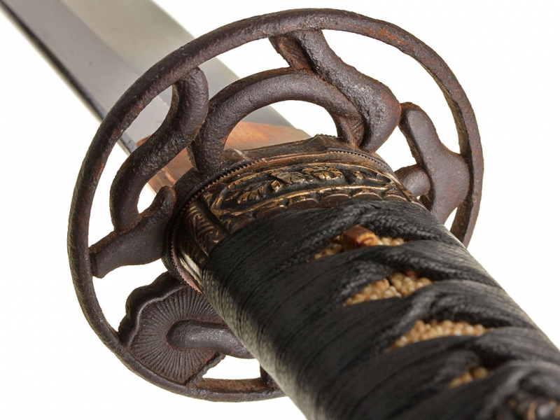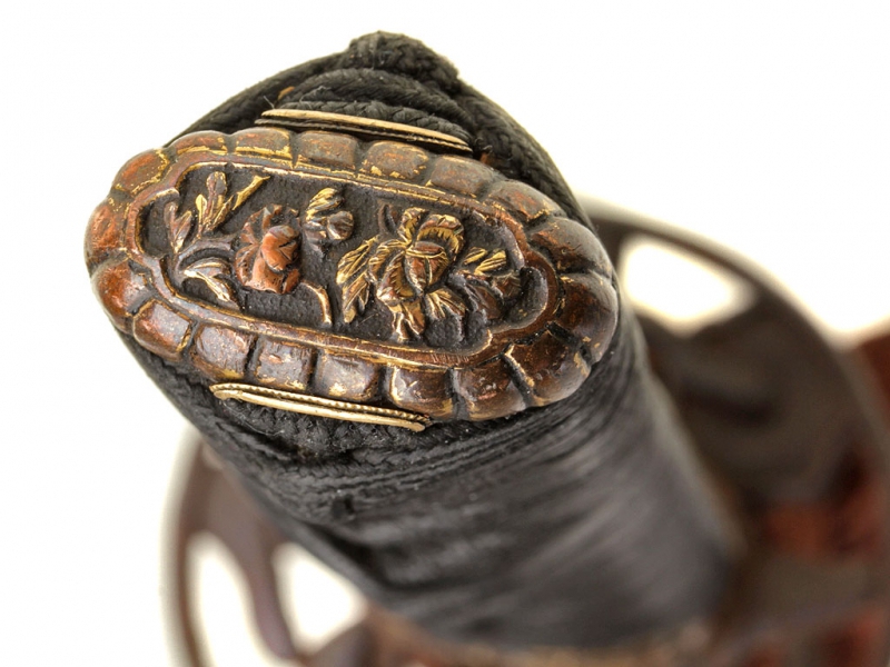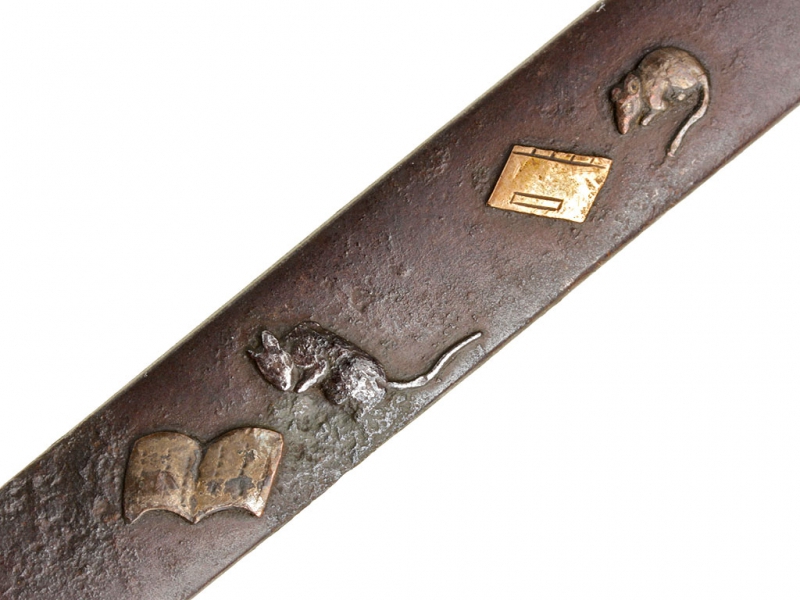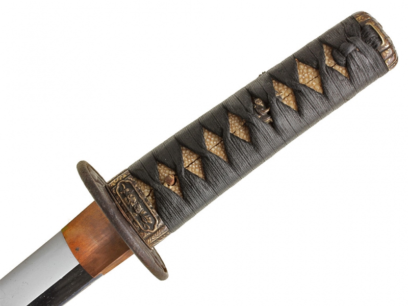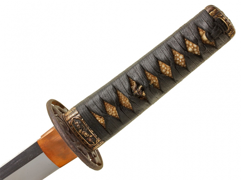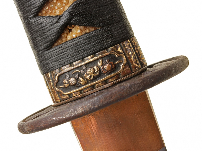Малый самурайский меч ко-вакидзаси, изготовленный в период Синто, эпоха Эдо. Хвостовик меча подписан мастером "Сукэсада", имеет одно крепежное отверстие. В стиле исполнения клинка сочетаются две традиции школ Старых мечей - провинции Ямасиро и Суэ-Бидзэн, из которой и выходили мастера с подписью "Сукэсада". Манера подписи из двух иероглифов без уточнения дзокумэй (личного имени) позволяет говорить только о времени изготовления без уточнения, который примерно из двадцати кузнецов, работавших в период Эдо, оставил данную подпись. Традиционно "Сукэсада" (имеется в виду не только чтение иероглифов, но и набор, составляющий имя) считается одним из самых распространенных производственных имен кузнецов провинции Бидзэн. Следует отметить, что образцы мечей с острием "о-киссаки" (большое острие) в школе Бидзэн выполнялись в подражание укороченным длиным мечам тати, относящимся к середине XIV века. Оправа соответствует классическому типу вакидзаси, оформленному в официальном стиле. Металлические детали оправы относятся к изделиям XIX века. Фути-касира составляют единый набор с изображением пионов - символов знатности и богатства. Изображение грибов на цубе - пожелание долголетия.