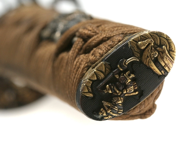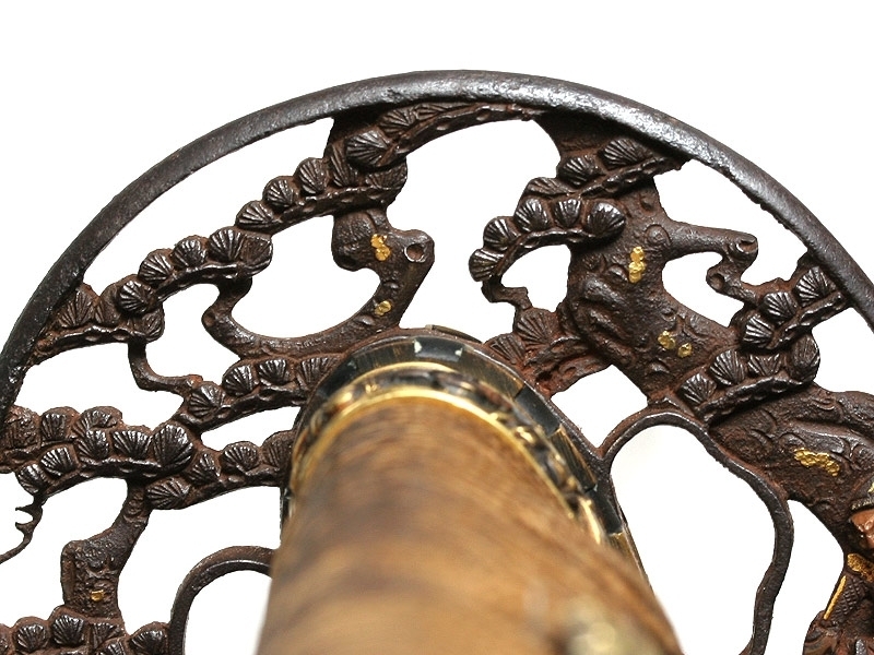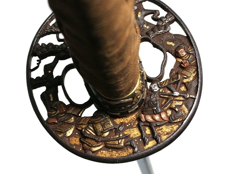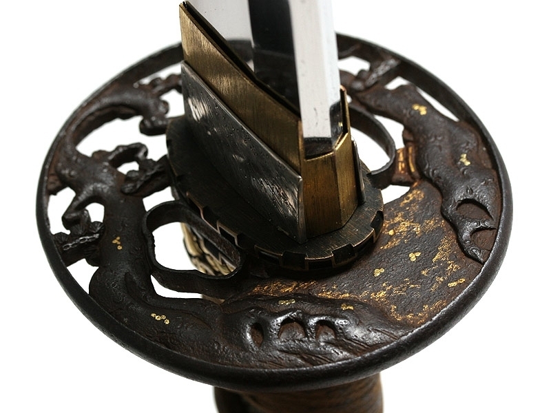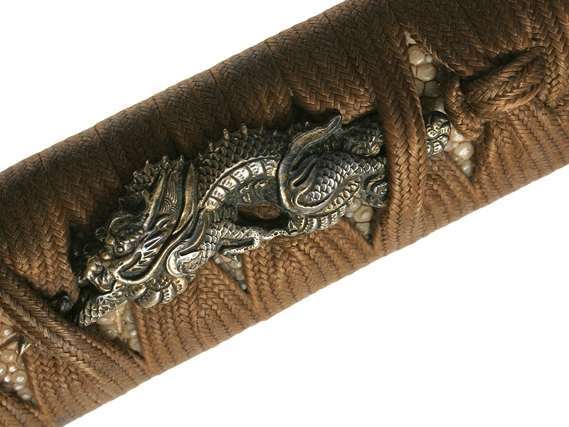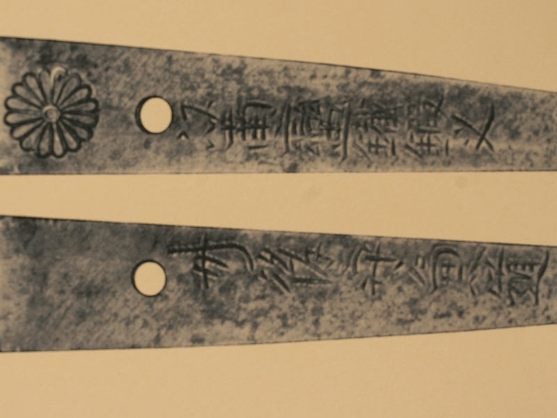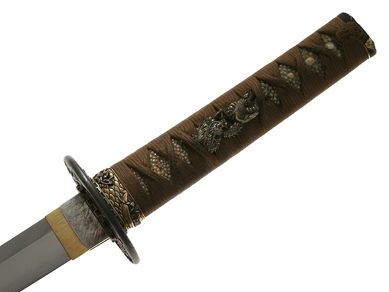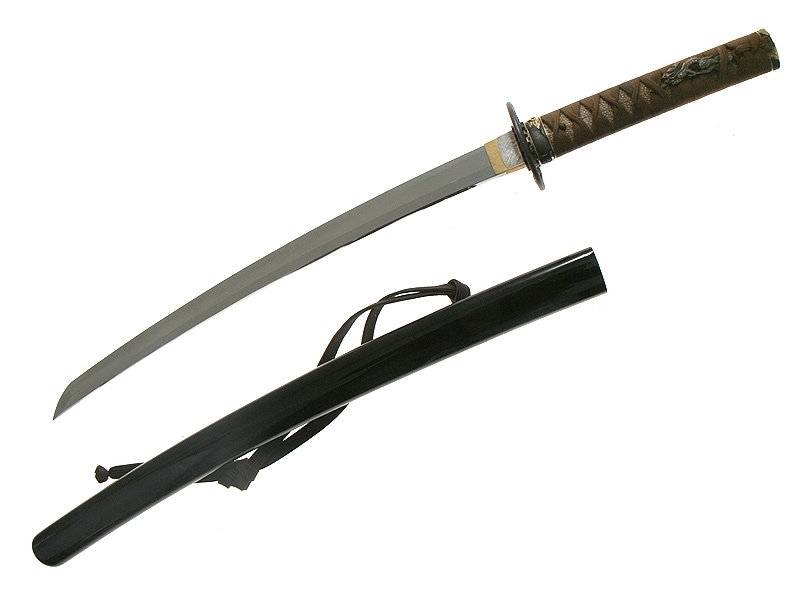 Малый самурайский меч вакидзаси работы мастера Танго-но Ками Канэмити I. Изготовлен во второй половине 20-х - 40-е годы XVII века. Клинок плотной ковки, с мелким древесным узором. На всей протяженности лезвия проходит непрерывная область закаленного края - якиба и его узор - хамон: он начинается как прямой и преобразуется затем в специфический узор "бамбукового занавеса" - сударэ-ба. Хвостовик меча имеет одно отверстие. С лицевой стороны расположена подпись кузнеца - мэй, образованная пятью иероглифами: "Танго-но Ками Канэмити". Обратная сторона имеет гравированное изображение стилизованной шестнадцатилепестковой хризантемы - дзюроку-кику-мон и шесть иероглифов, заключающих в себе информацию о материале, использованном при изготовлении меча: "Нанбан-тэцу-во моттэ корэ-во китаэ" (Выковано с применением железа южных варваров). Рукоять деревянная, обтянутая кожей ската, с оплеткой шелковым шнуром. С обеих сторон размещены парные объемные накладки в виде изображения "крадущегося дракона". Цуба и все металлические элементы рукояти представляют собой единый комплект, декорированный изображениями самураев из исторического эпоса "Повесть о доме Тайра". Ножны покрыты черным блестящим лаком.
