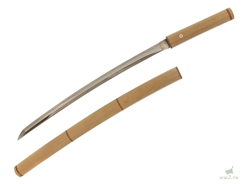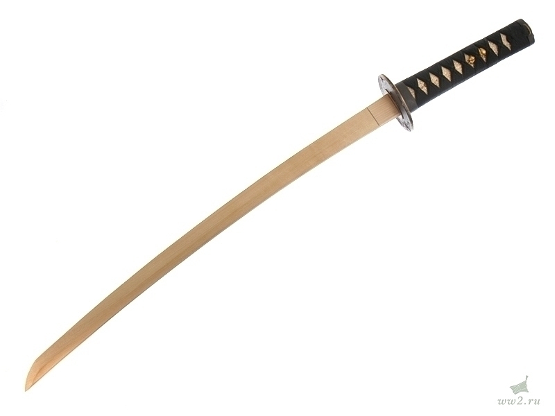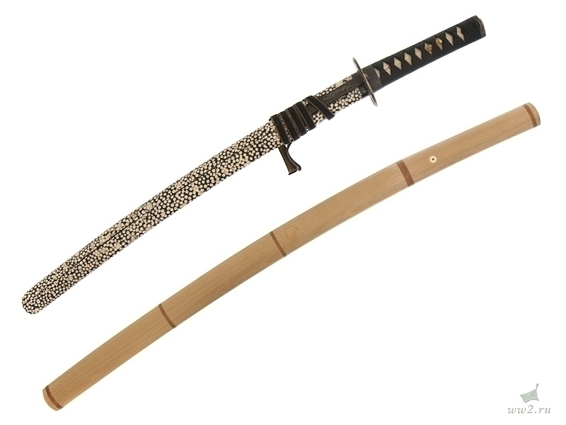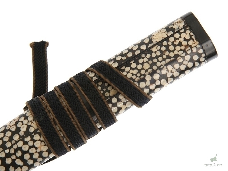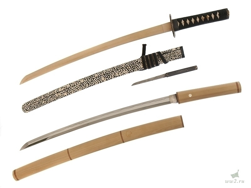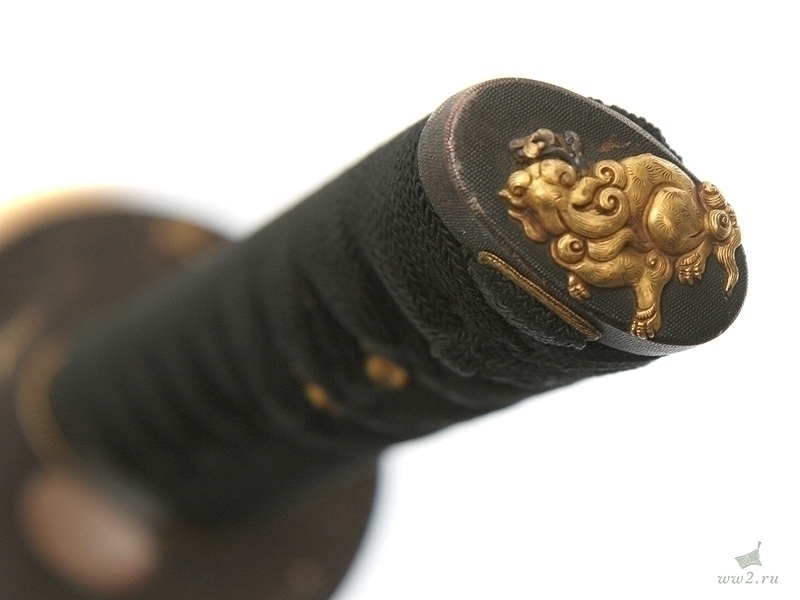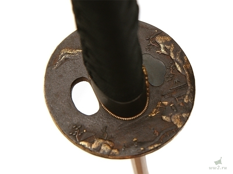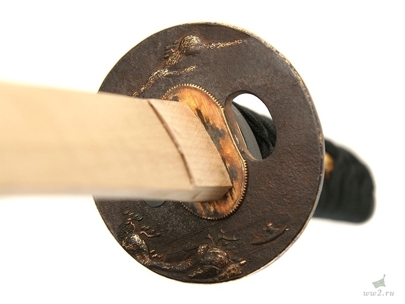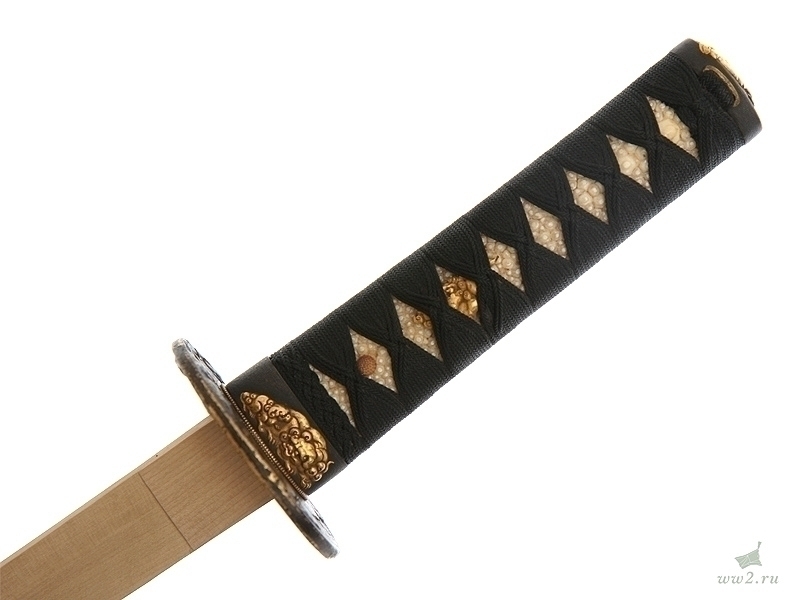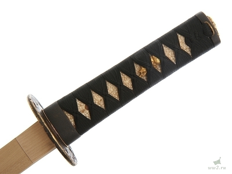 Рукоять деревянная, имеющая подложку из кожи ската (самэ), оплетена шелковым шнуром. Под оплетку вставлены миниатюры (мэнуки).
